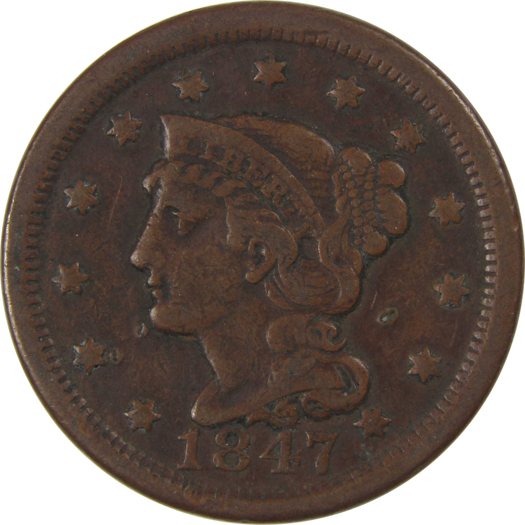 A genuine 1847 Braided Hair Copper Large Cent Penny Coin, in VF Very Fine Condition