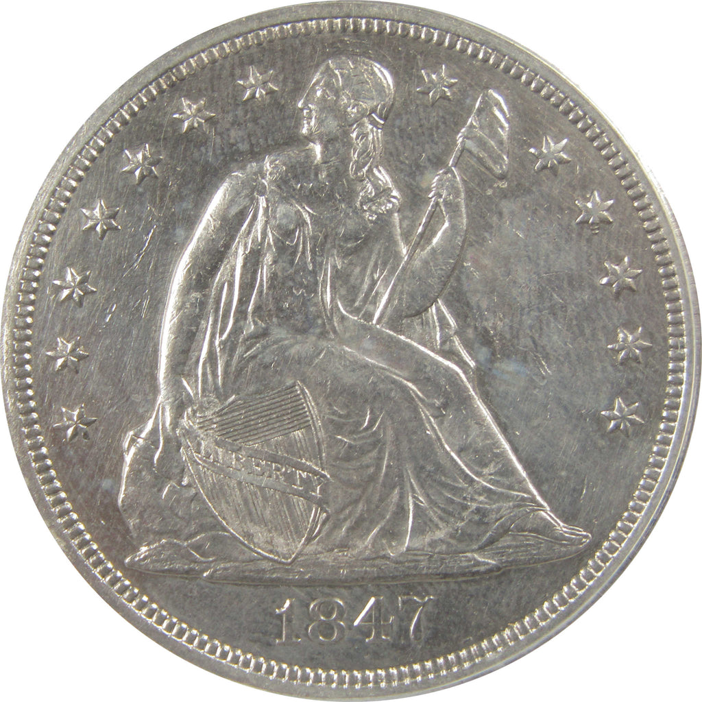 A genuine 1847 Seated Liberty Silver Dollar Coin, graded and certified AU 55 Details by ANACS. Contains 90% Silver. Cleaned