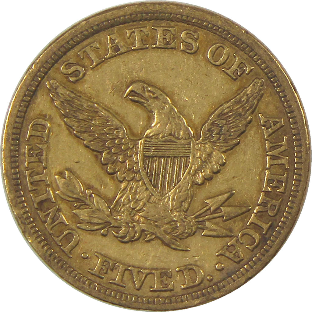 This gold Liberty Head half eagle - also called a Coronet Head or Braided Hair half eagle - bears Christian Gobrecht's classic designs. The obverse depicts 13 stars around Liberty, who wears a diadem and her hair in a bun held by a string of beads. On the reverse, an American eagle with Union Shield holds an olive branch and three arrows. The denomination FIVE D. and UNITED STATES OF AMERICA encircle the reverse.