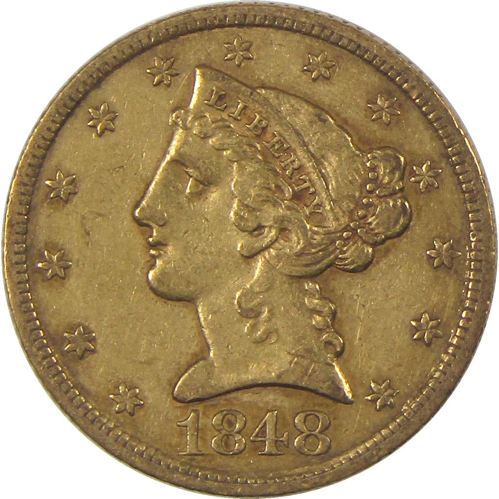 A genuine 1848 $5 Liberty Head Gold Half Eagle Coin, in XF EF Extremely Fine Condition. Contains 90% Gold