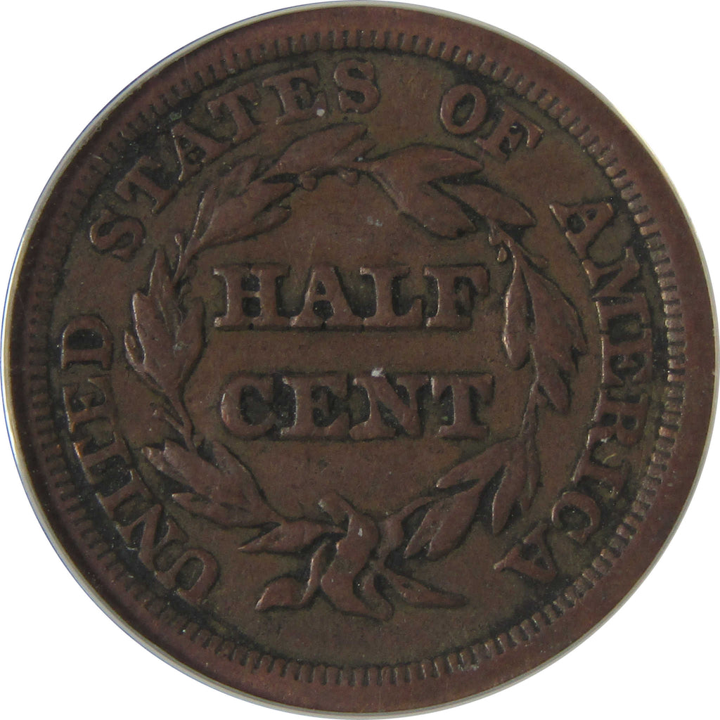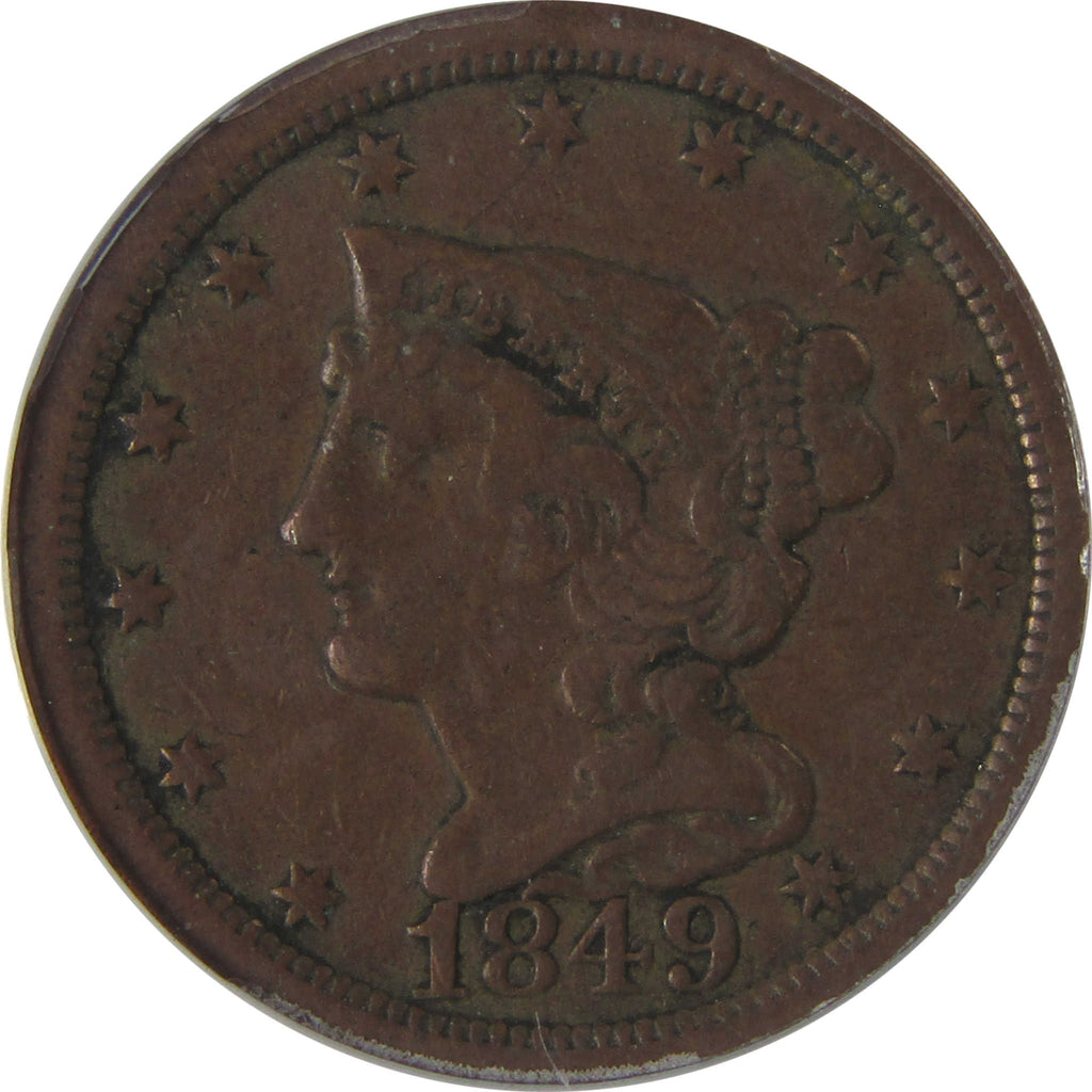 A genuine 1849 Large Date Braided Hair Copper Half Cent Penny Coin, graded and certified VF 20 by ANACS
