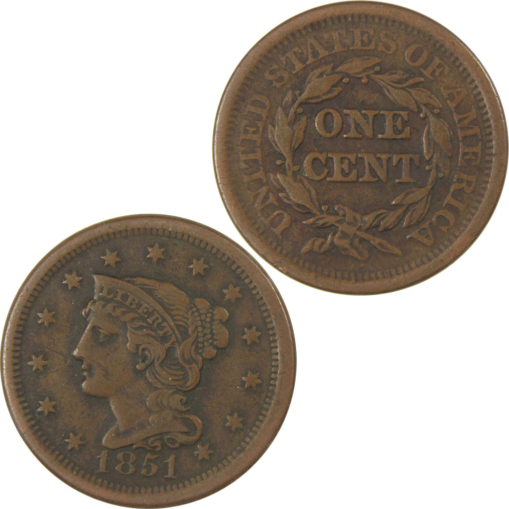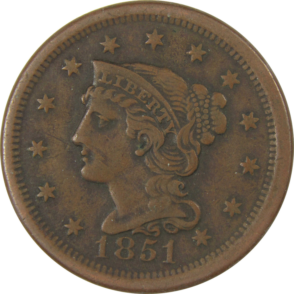 A genuine 1851 Braided Hair Copper Large Cent Penny Coin, in VF Very Fine Condition