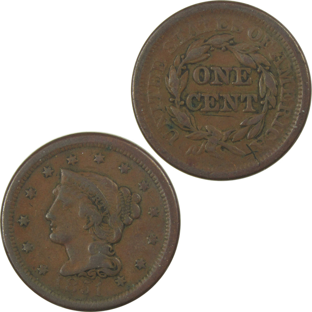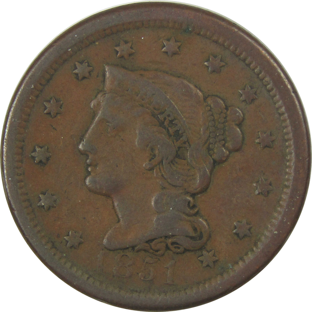 A genuine 1851 Braided Hair Copper Large Cent Penny Coin, in F Fine Condition