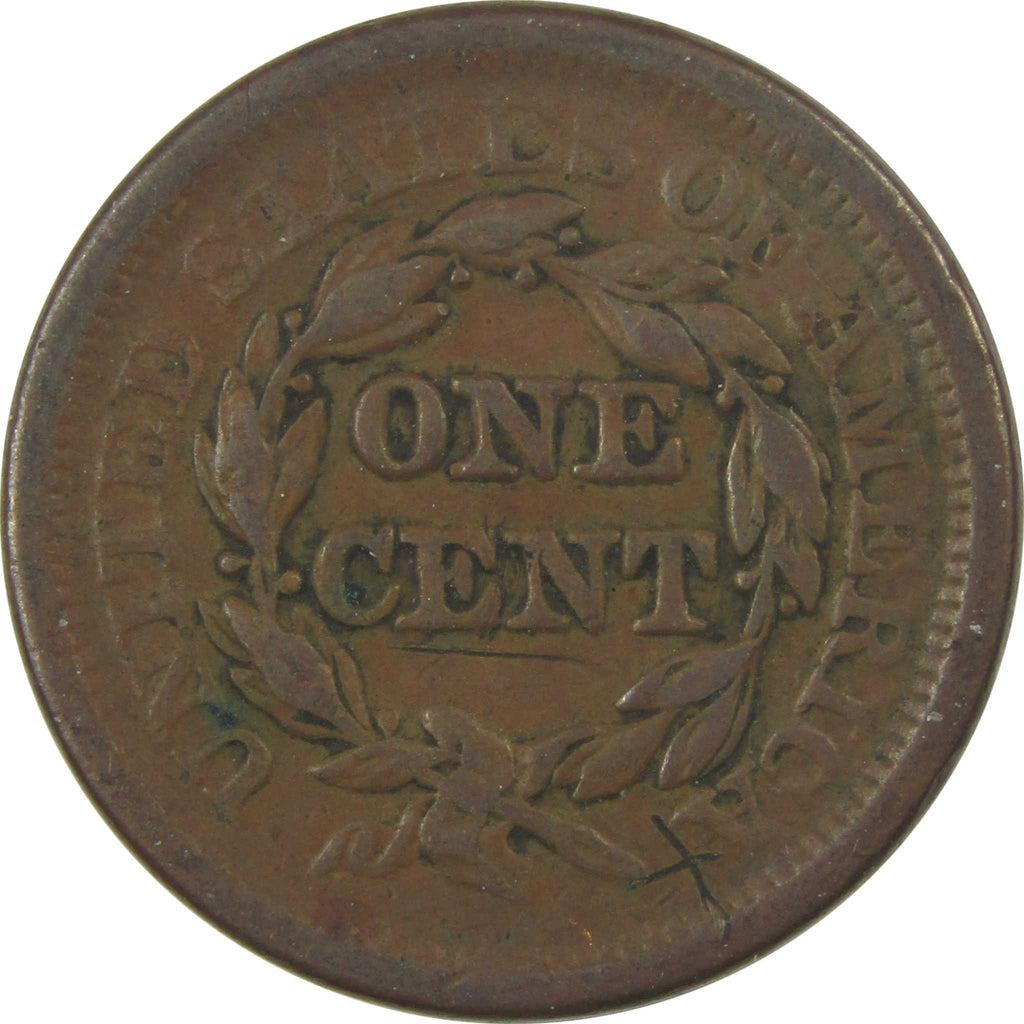 Struck over 150 years ago, this copper Braided Hair large cent bears Christian Gobrecht's classic design. Its obverse depicts Liberty in a diadem, her long tresses held in a bun held by two beaded cords. The reverse bears ONE CENT encircled by a wreath and UNITED STATES OF AMERICA.