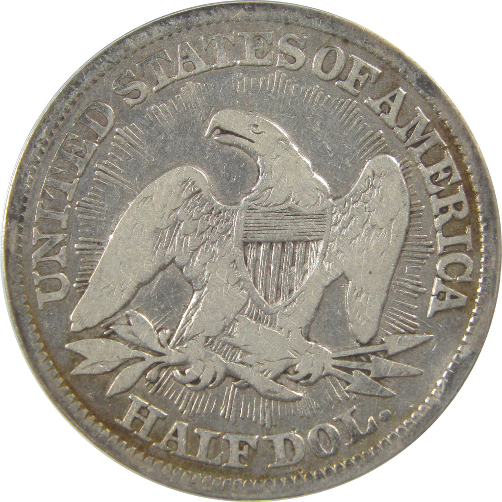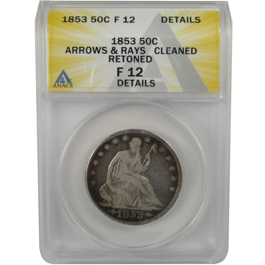 A genuine 1853 Arrows and Rays Seated Liberty Silver Half Dollar Coin, graded and certified F 12 Details by ANACS. Contains 90% Silver. Cleaned, Retoned
