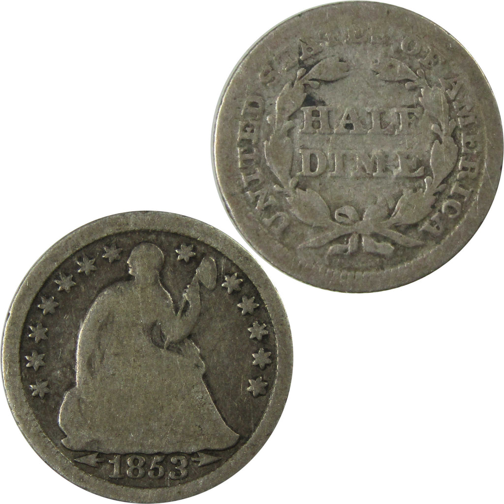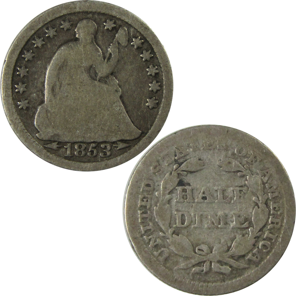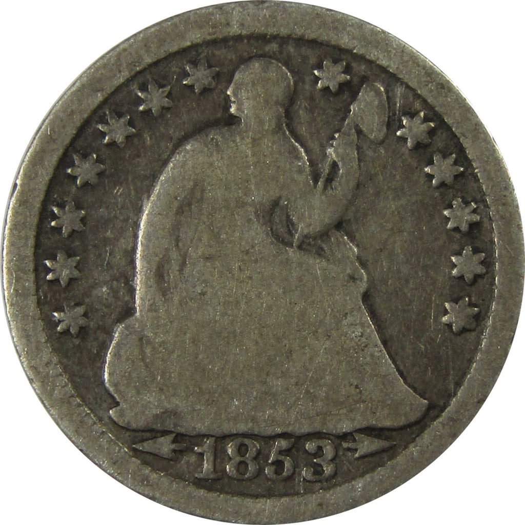 A genuine 1853 Arrows Seated Liberty Silver Dime Coin, in G Good Condition. Contains 90% Silver