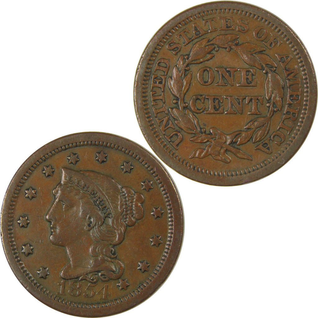 A genuine 1854 Braided Hair Copper Large Cent Penny Coin, in XF EF Extremely Fine Condition