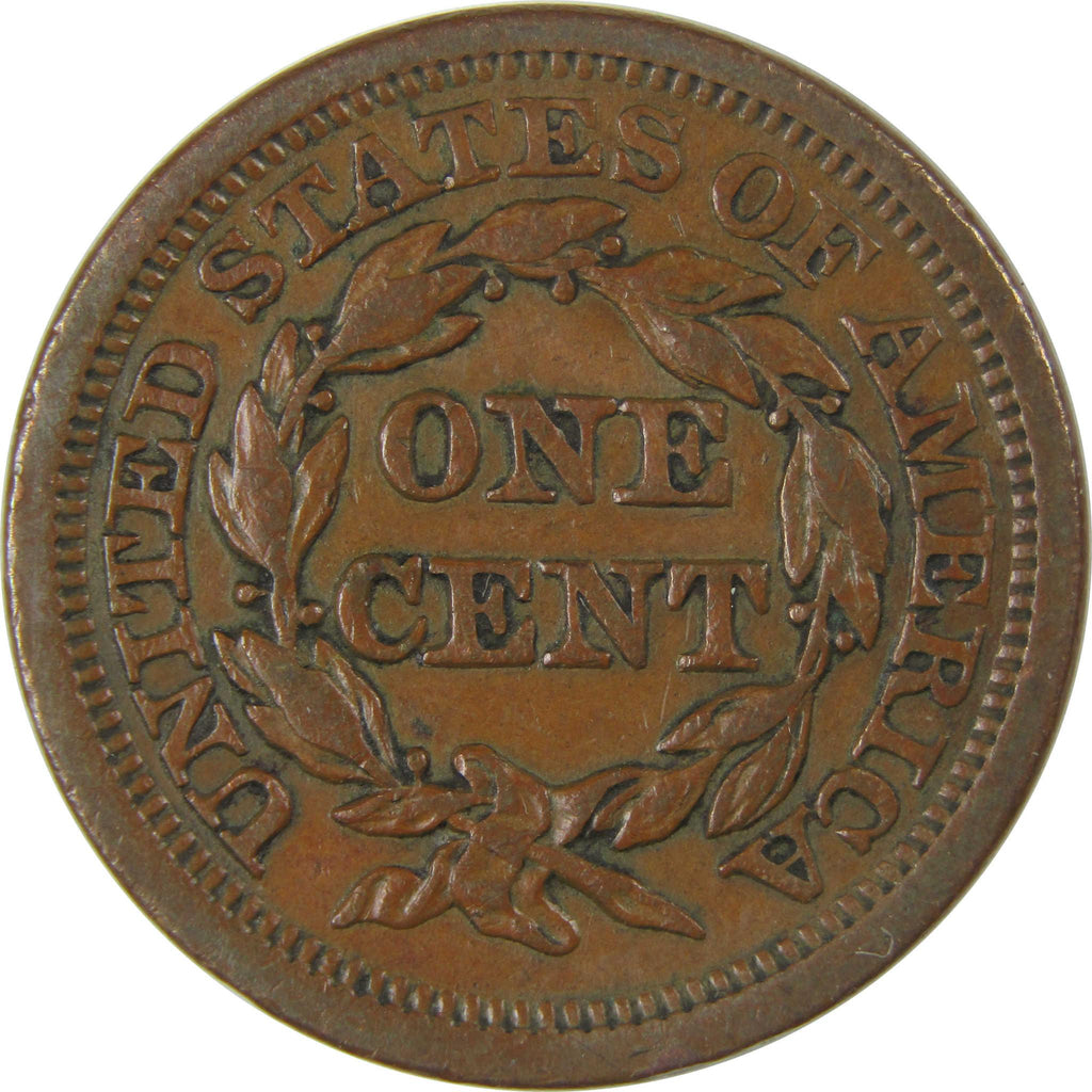 Struck over 150 years ago, this copper Braided Hair large cent bears Christian Gobrecht's classic design. Its obverse depicts Liberty in a diadem, her long tresses held in a bun held by two beaded cords. The reverse bears ONE CENT encircled by a wreath and UNITED STATES OF AMERICA.