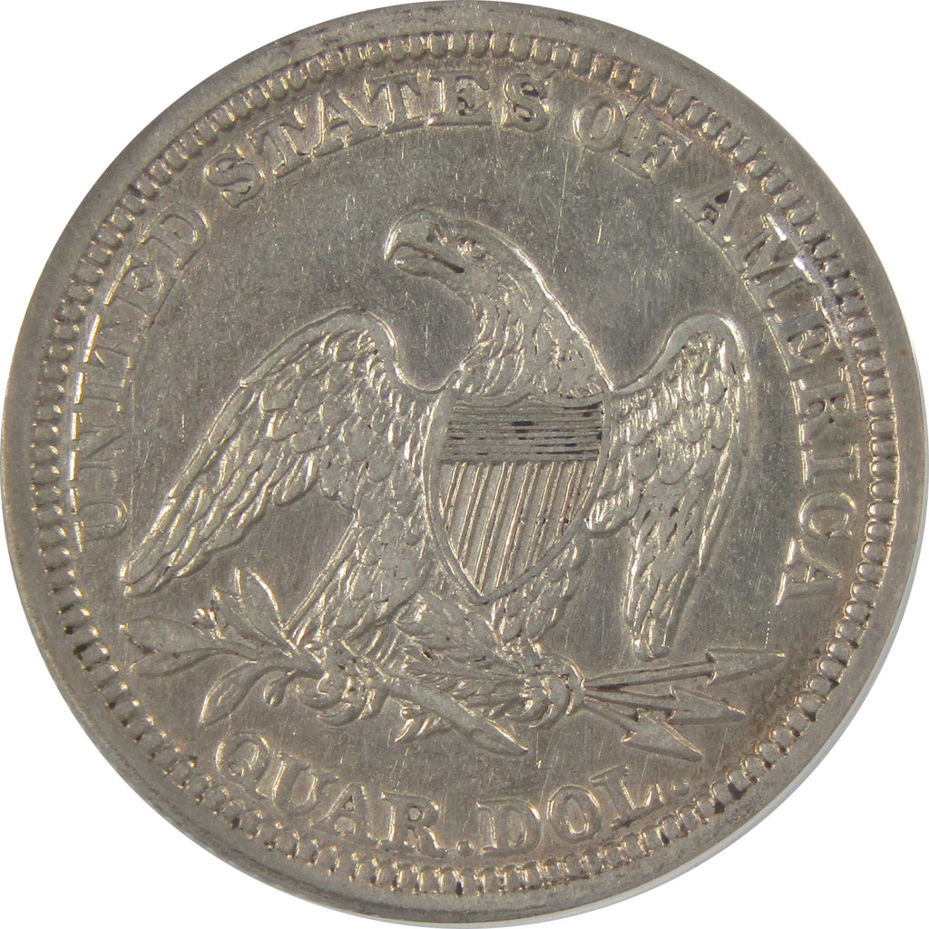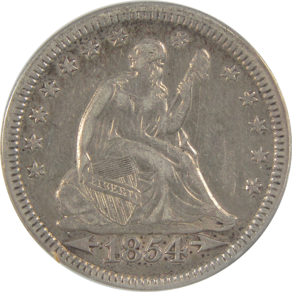 A genuine 1854 Seated Liberty Silver Quarter Coin, graded and certified EF 45 Details by ANACS. Contains 90% Silver. Cleaned