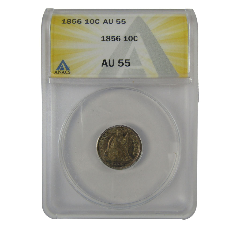 A genuine 1856 Small Date Seated Liberty Silver Dime Coin, graded and certified AU 55 by ANACS. Contains 90% Silver