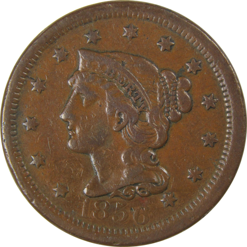 A genuine 1856 Upright 5 Braided Hair Copper Large Cent Penny Coin, in VF Very Fine Condition
