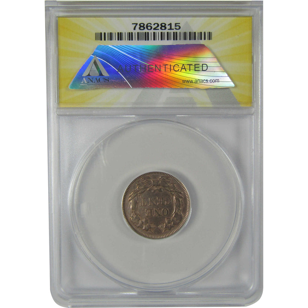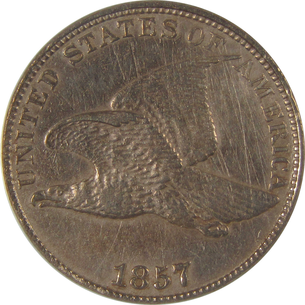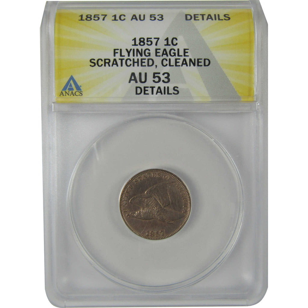 A genuine 1857 Flying Eagle Cent Penny Coin, graded and certified AU 53 Details by ANACS. Scratched, Cleaned