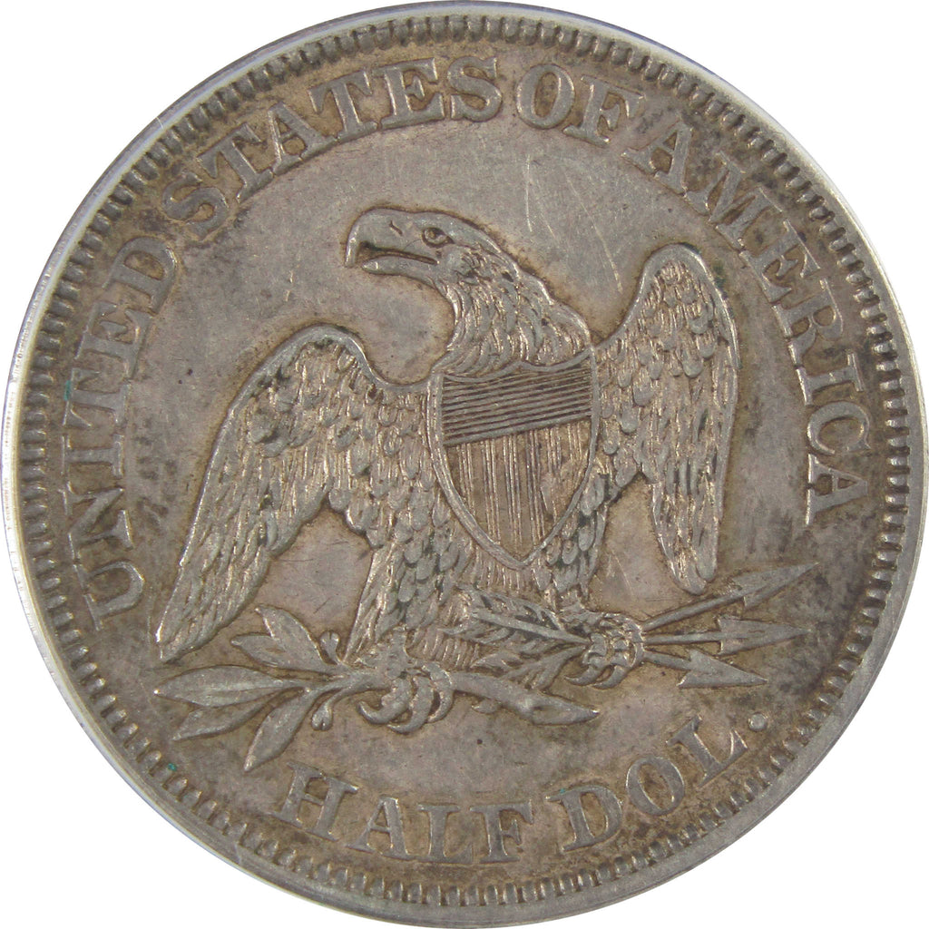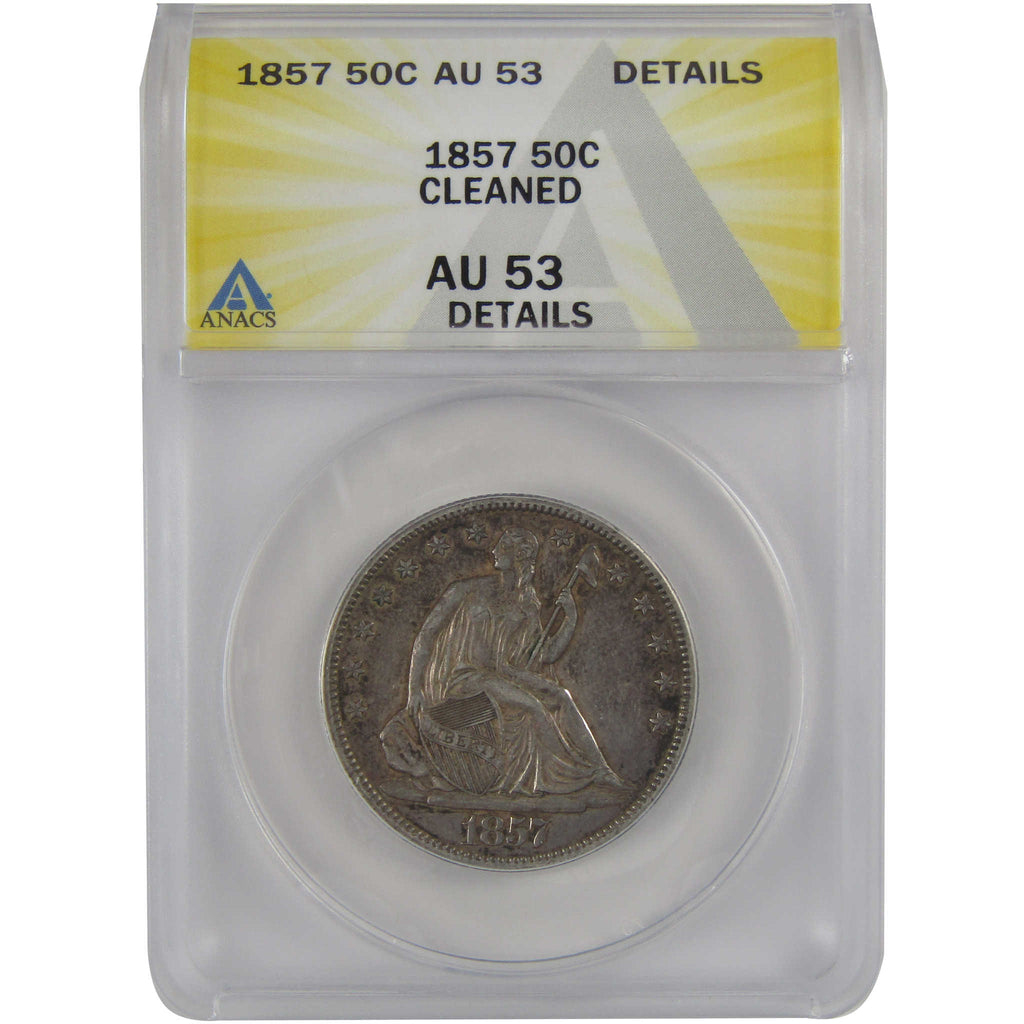 A genuine 1857 Seated Liberty Silver Half Dollar Coin, graded and certified AU 53 Details by ANACS. Contains 90% Silver. Cleaned