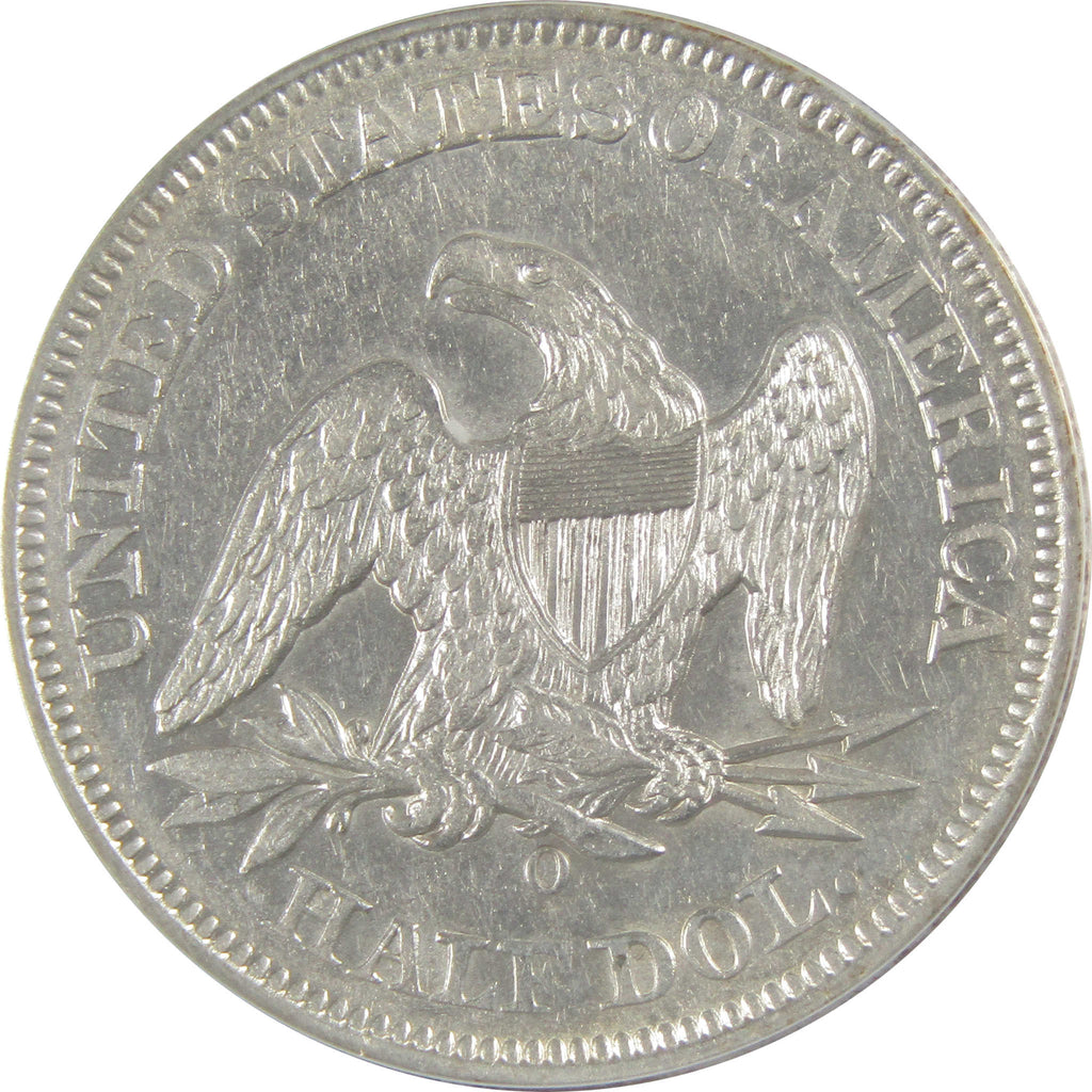 A genuine 1858 O Seated Liberty Silver Half Dollar Coin, graded and certified AU 53 Details by ANACS. Contains 90% Silver. Cleaned