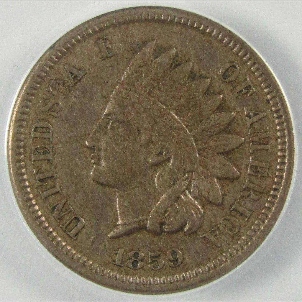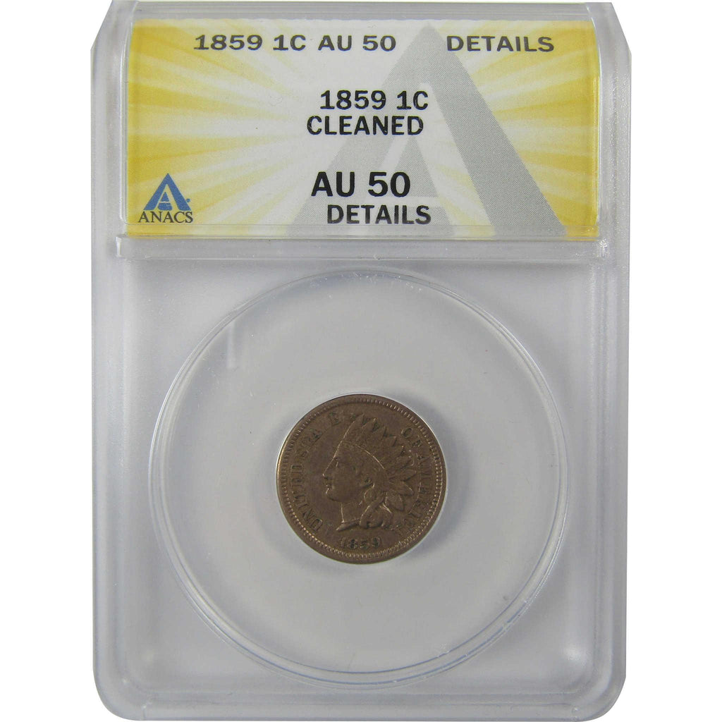 A genuine 1859 Indian Head Cent Penny Coin, graded and certified AU 50 Details by ANACS. Cleaned