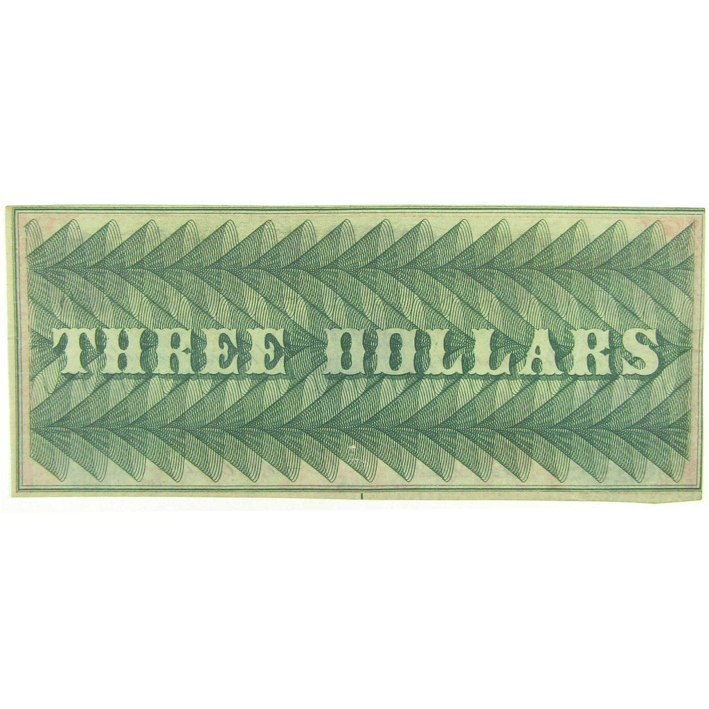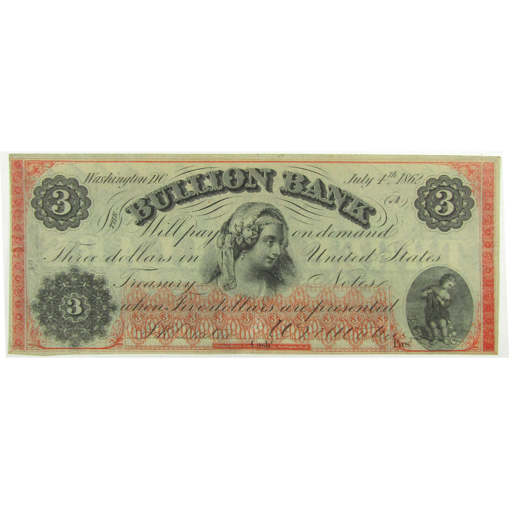 A genuine 1862 Bullion Bank, Washington DC, $3 Obsolete Note, in Uncirculated Details Condition. Pin Holes