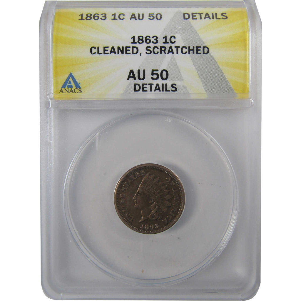 A genuine 1863 Indian Head Cent Penny Coin, graded and certified AU 50 Details by ANACS. Cleaned, Scratched