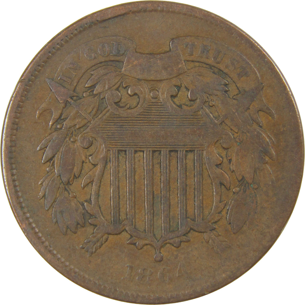 A genuine 1864 Large Motto Two Cent Piece Coin, in F Fine Condition