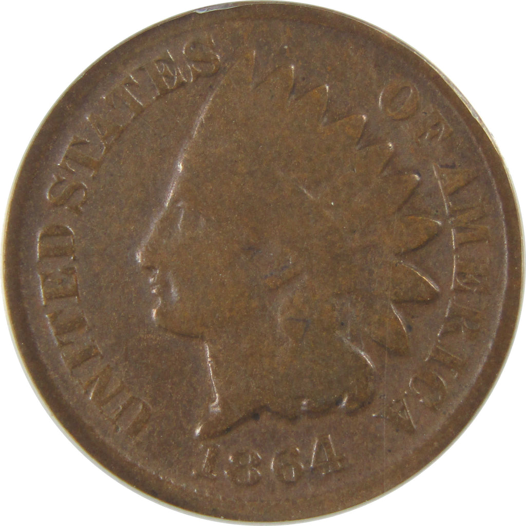 A genuine 1864 No L Indian Head Bronze Cent Penny Coin, graded and certified VG 8 Details by ANACS. Damaged