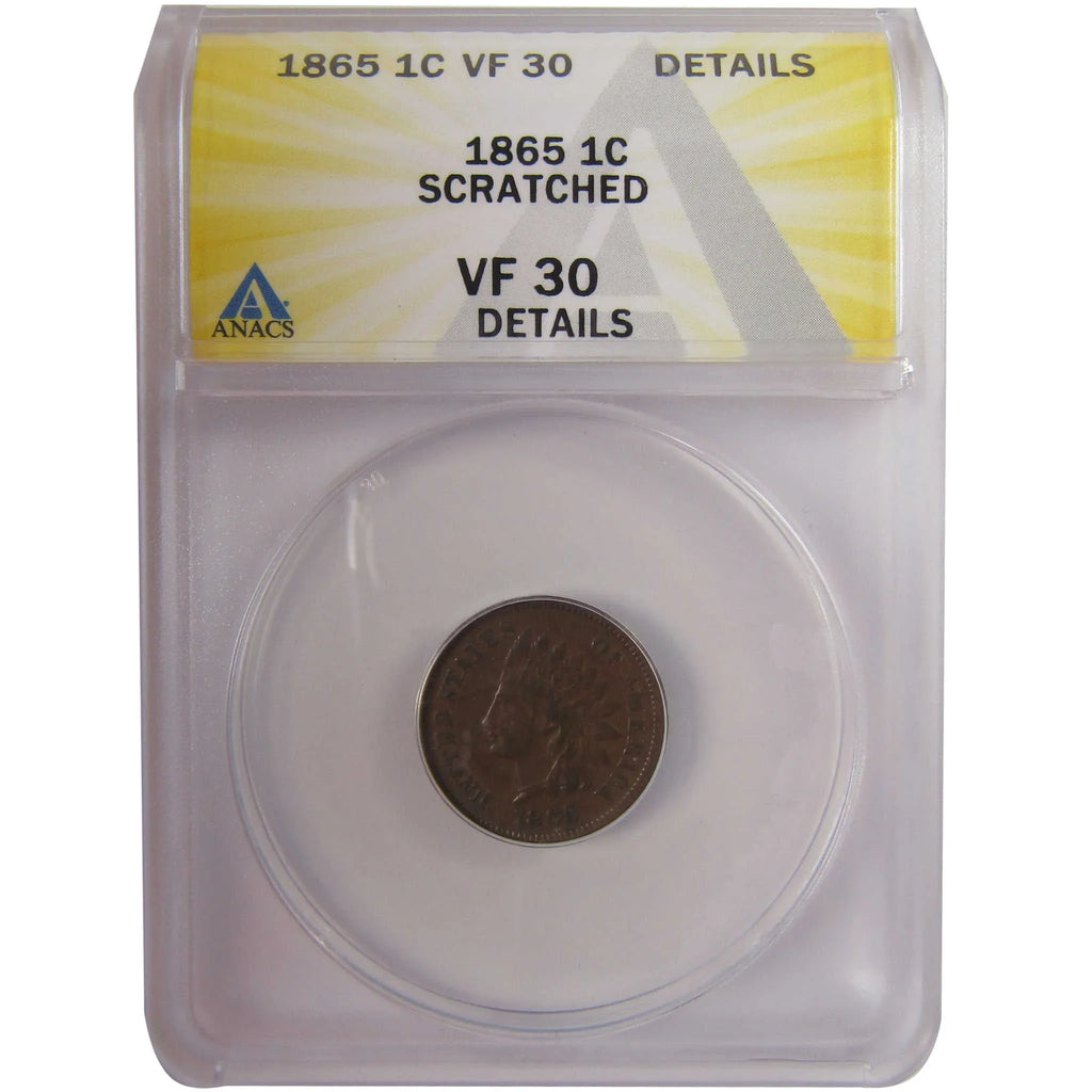A genuine 1865 Indian Head Cent Penny Coin, graded and certified VF 30 Details by ANACS. Scratched