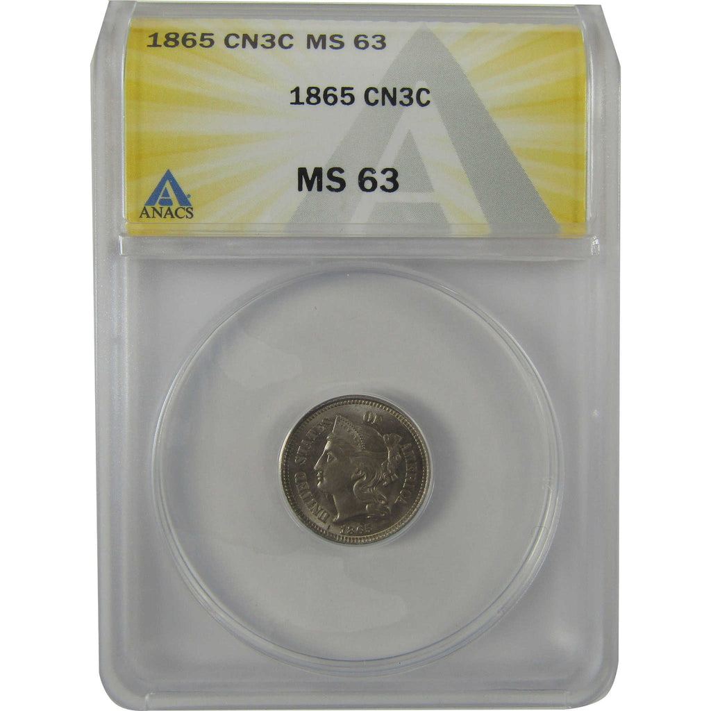 A genuine 1865 Nickel Three Cent Piece Coin, graded and certified MS 63 by ANACS