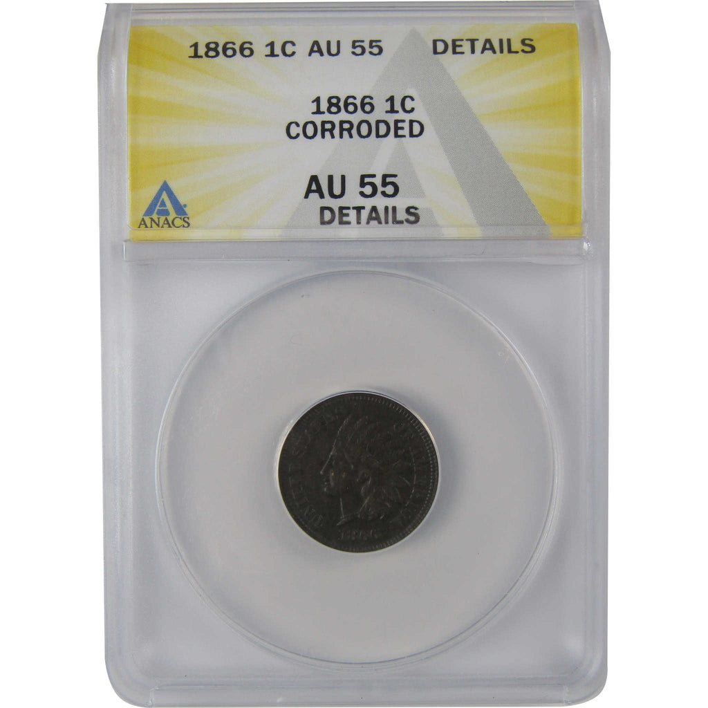 A genuine 1866 Indian Head Cent Penny Coin, graded and certified AU 55 Details by ANACS. Corroded