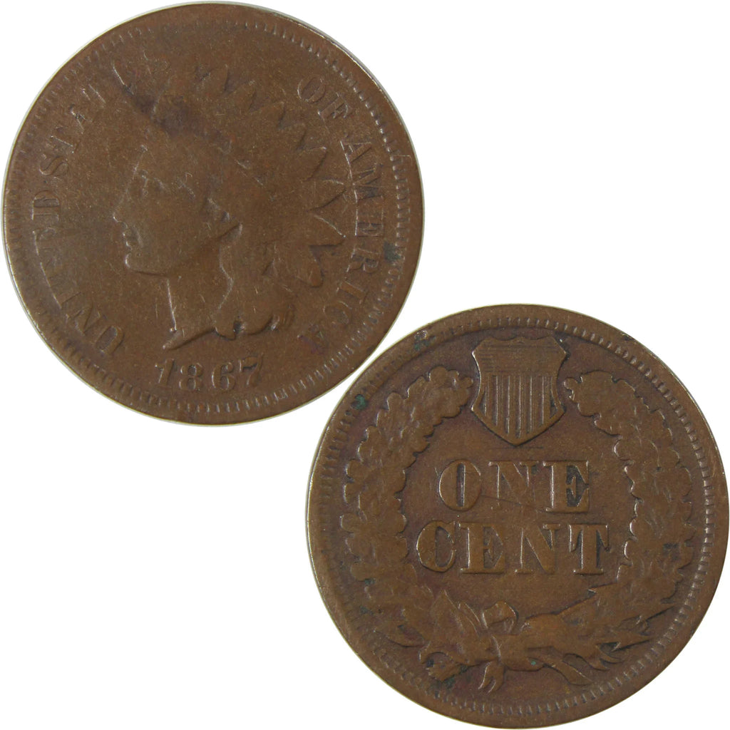 A genuine 1867 Indian Head Cent Penny Coin, in VG Very Good Details Condition. Bent