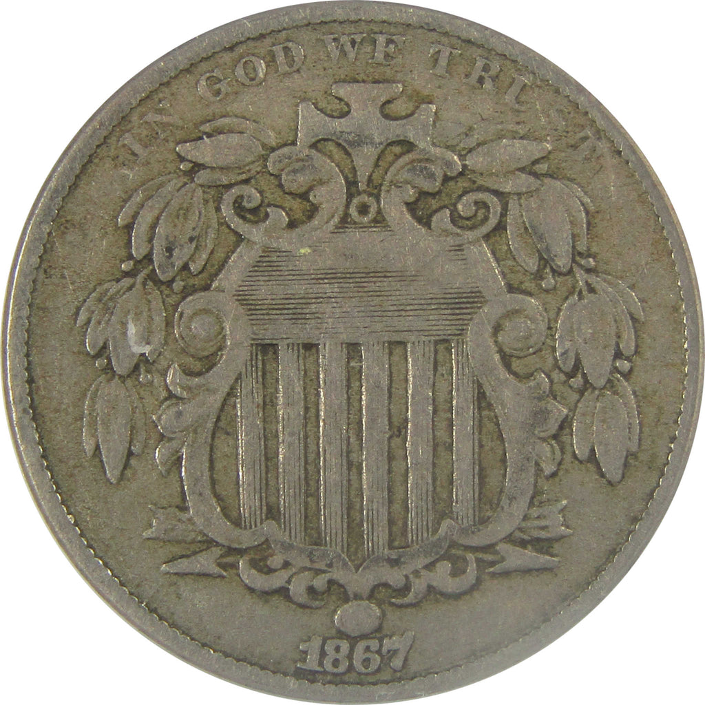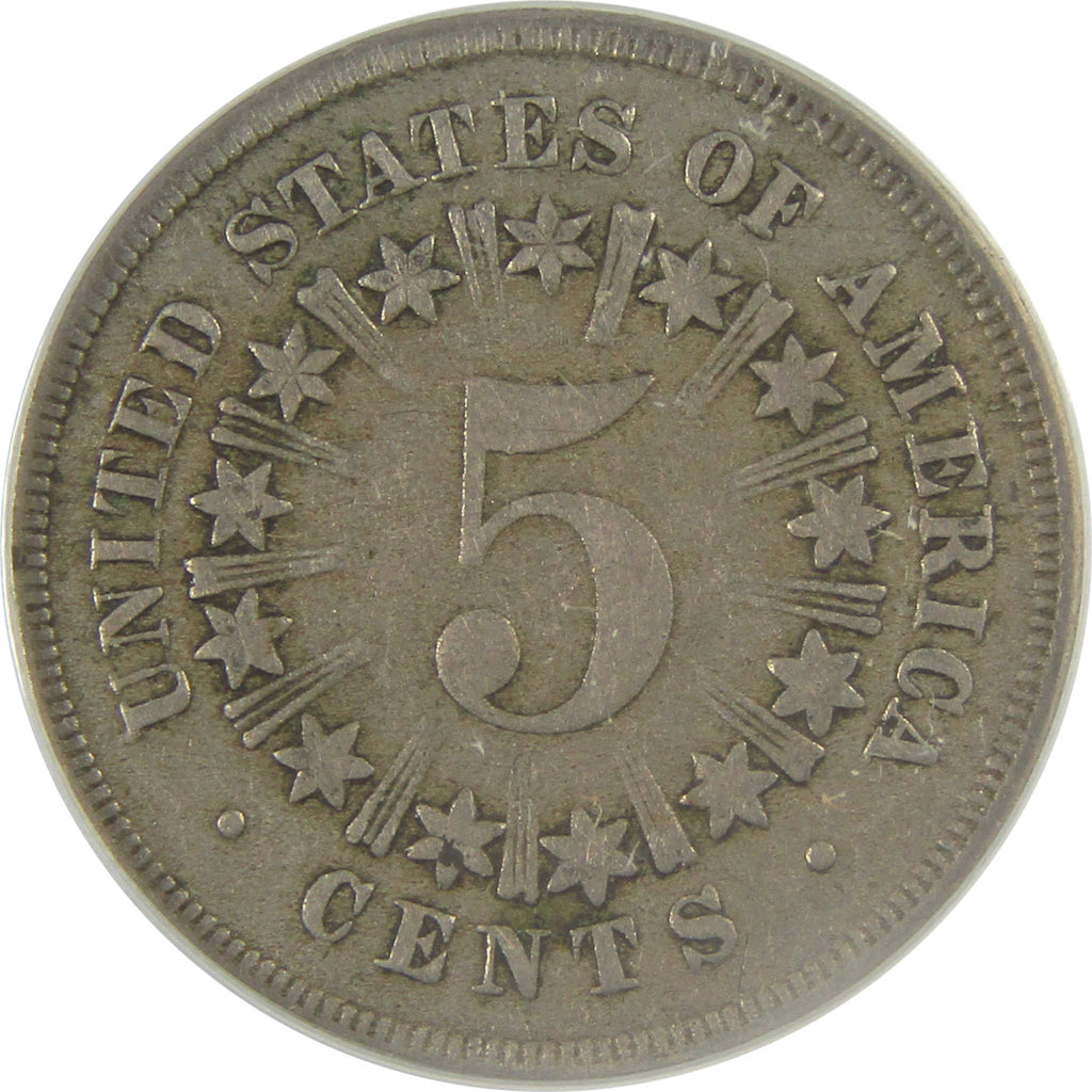 The classic Shield nickel of 1866-1883 replaced the silver half dimes of 1794-1873. The coin's obverse depicts a shield and wreath, while the reverse features a large numeral "5" inside a circle of 13 stars above the word CENTS.