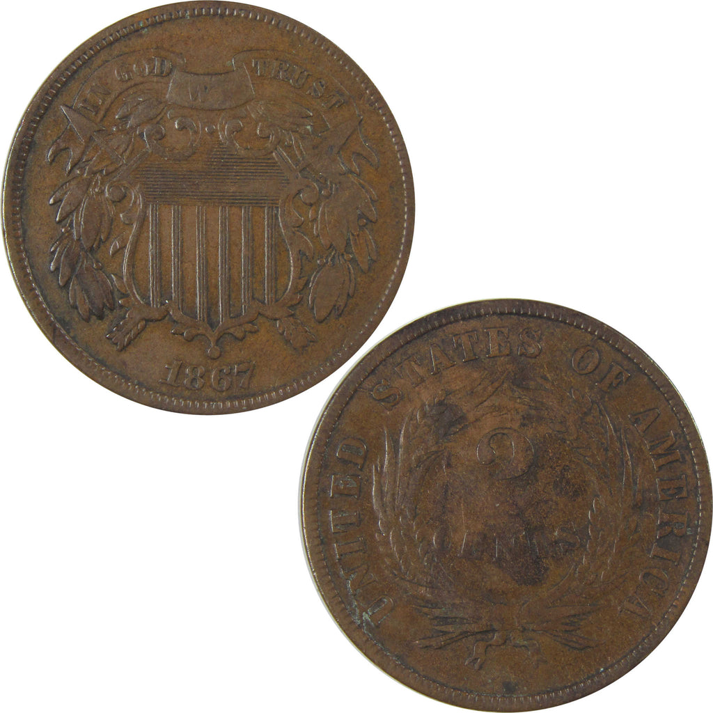 A genuine 1867 Two Cent Piece Coin, in F Fine Condition