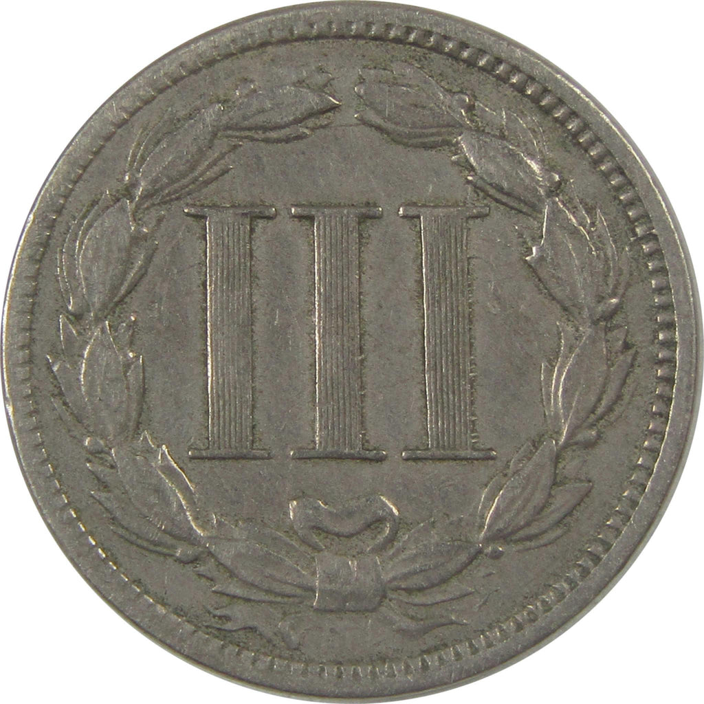 Struck over 130 years ago, this nickel three-cent piece bears James B. Longacre's classic design. It depicts Liberty in a diadem inscribed LIBERTY, her long hair in an intricate braid. The reverse bears the Roman numeral III inside by a laurel wreath.