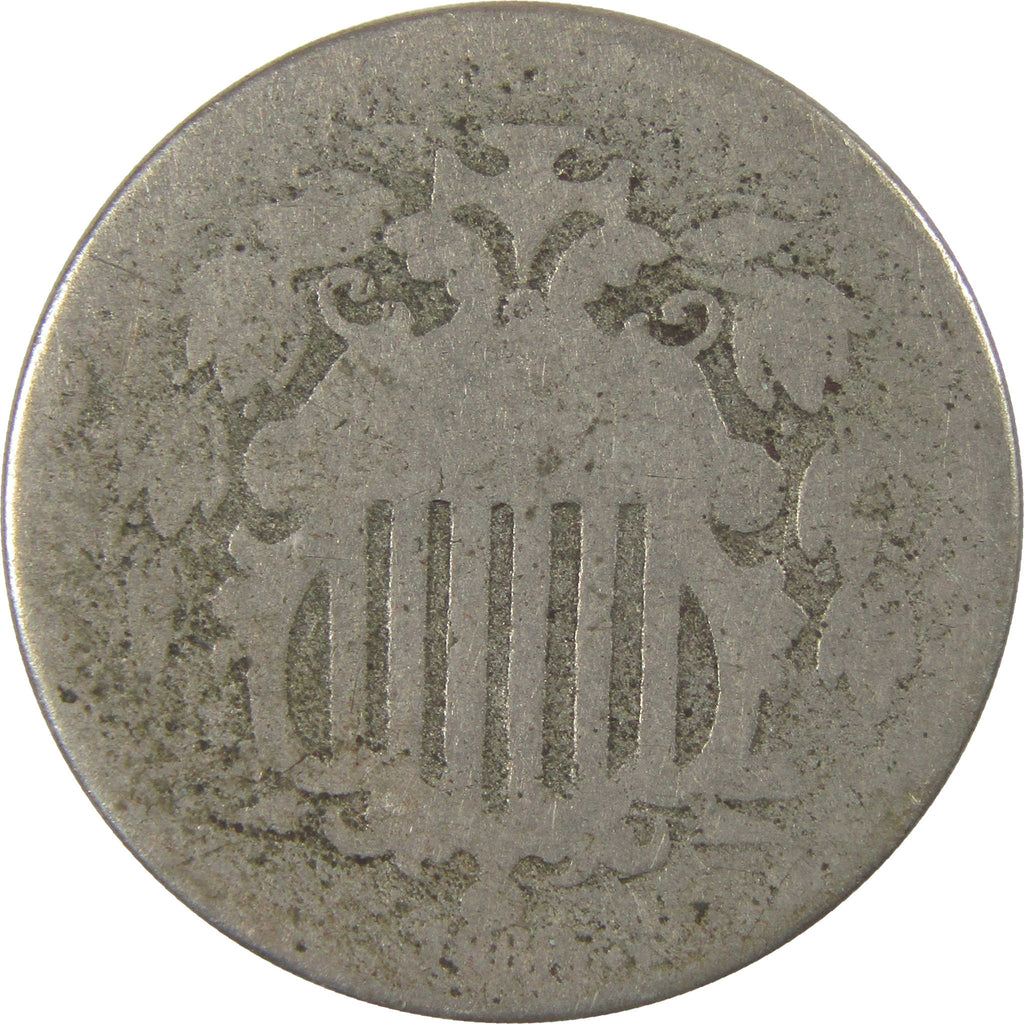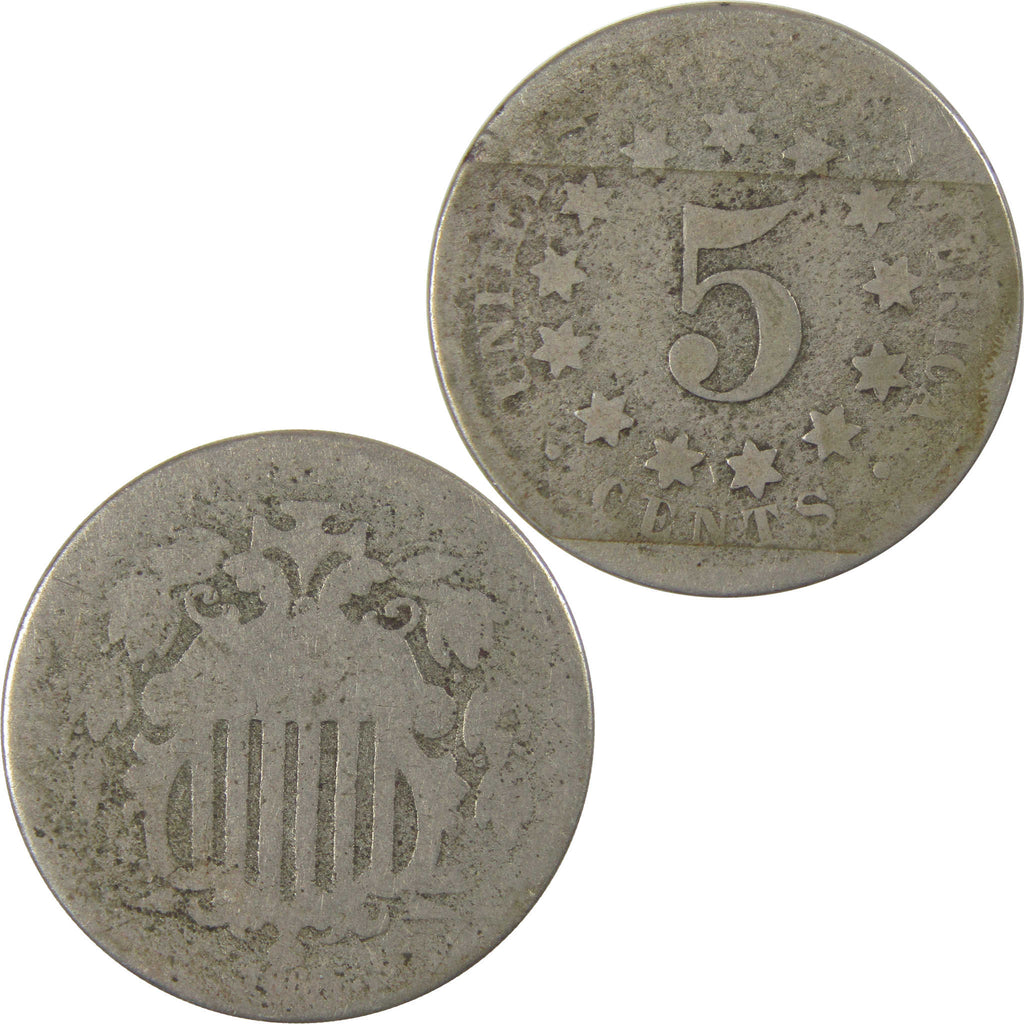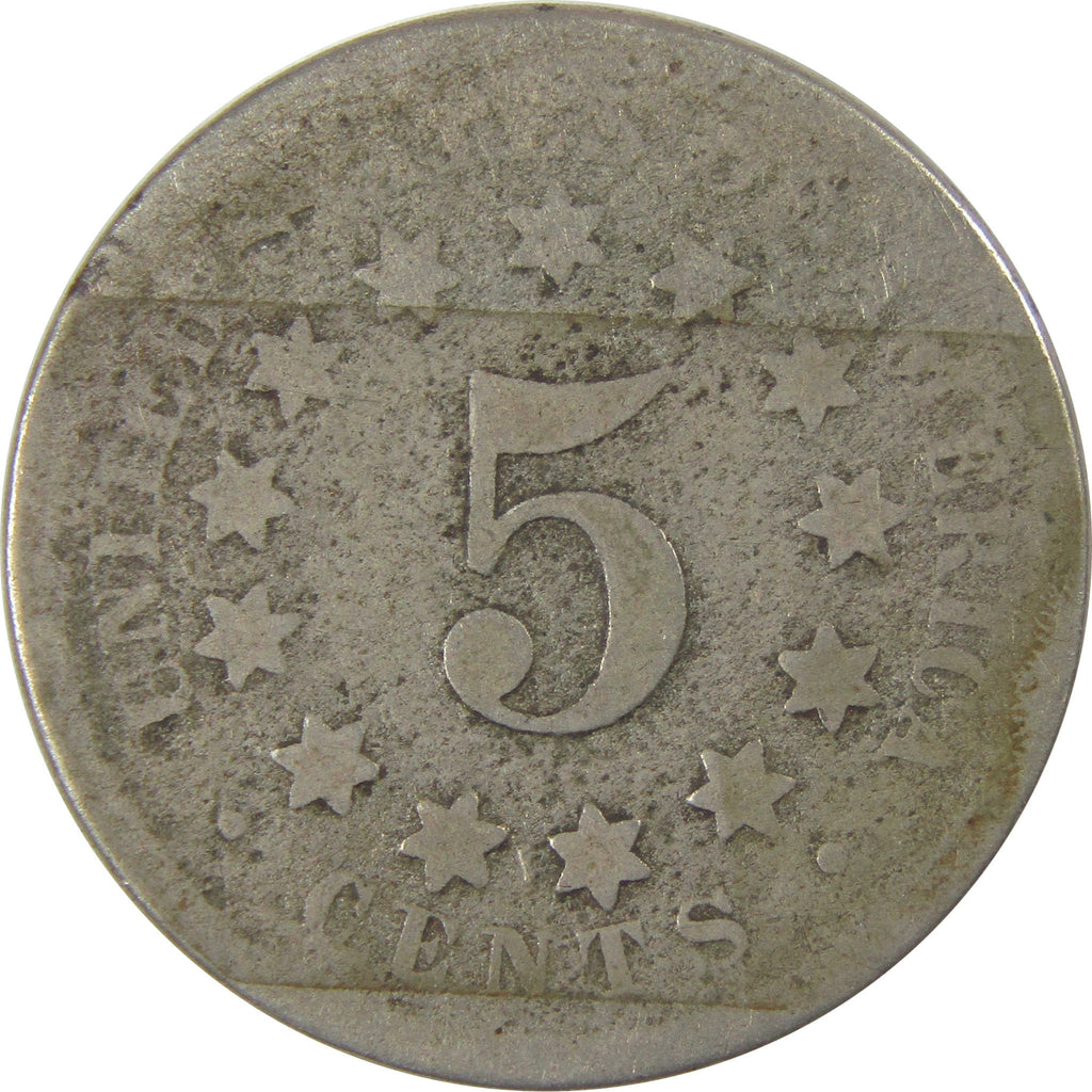 The classic Shield nickel of 1866-1883 replaced the silver half dimes of 1794-1873. The coin's obverse depicts a shield and wreath, while the reverse features a large numeral "5" inside a circle of 13 stars above the word CENTS.