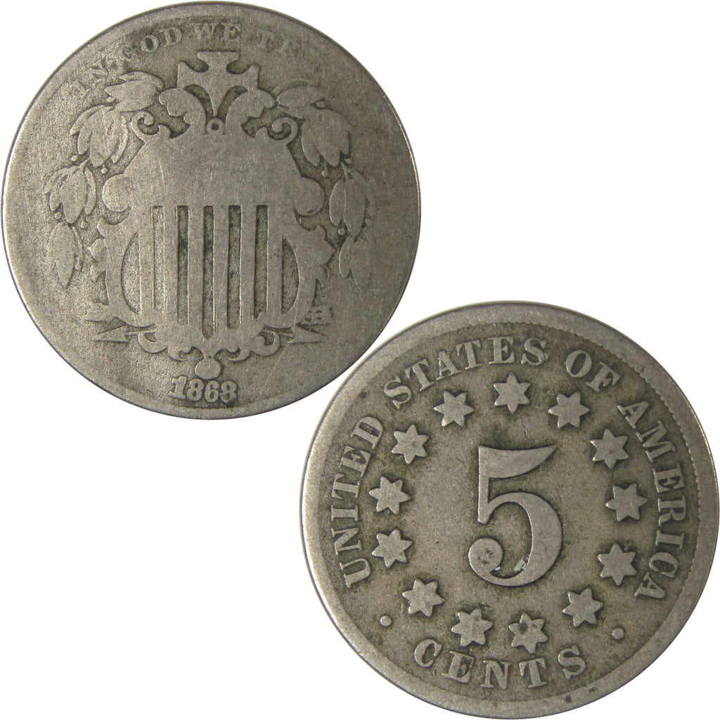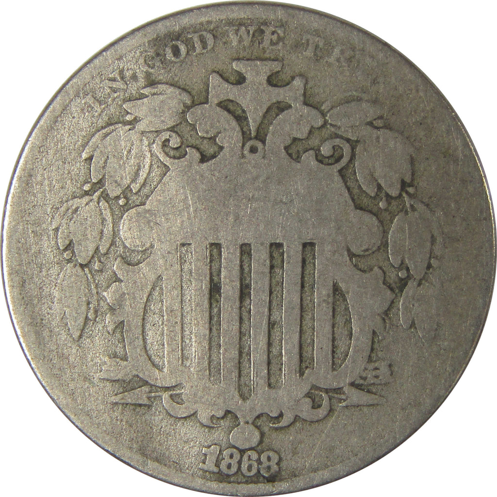 A genuine 1868 Shield Nickel Coin, in G Good Details Condition. Cleaned