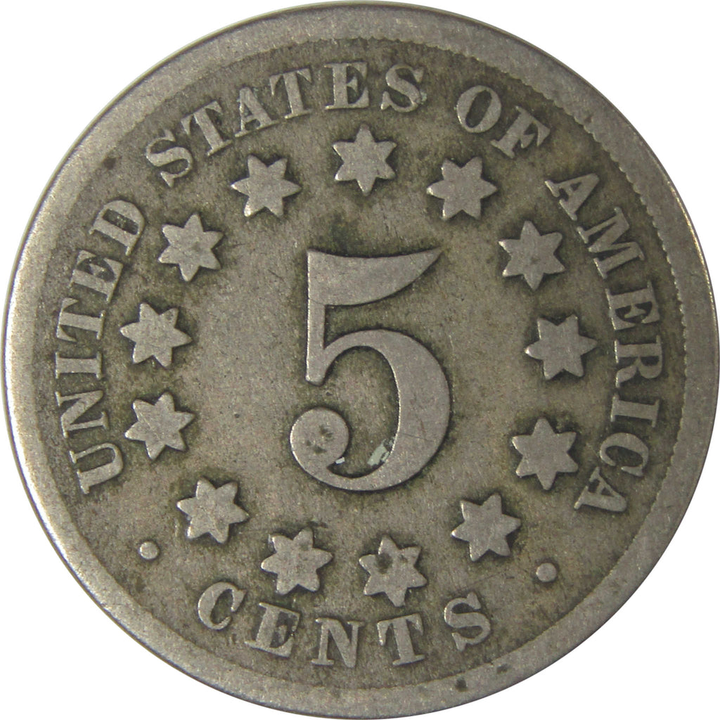 The classic Shield nickel of 1866-1883 replaced the silver half dimes of 1794-1873. The coin's obverse depicts a shield and wreath, while the reverse features a large numeral "5" inside a circle of 13 stars above the word CENTS.