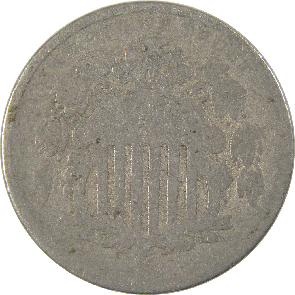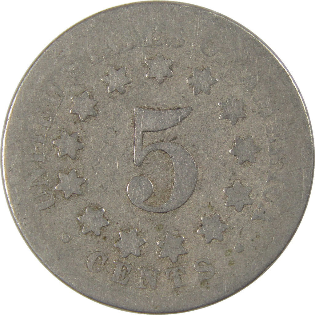 The classic Shield nickel of 1866-1883 replaced the silver half dimes of 1794-1873. The coin's obverse depicts a shield and wreath, while the reverse features a large numeral "5" inside a circle of 13 stars above the word CENTS.