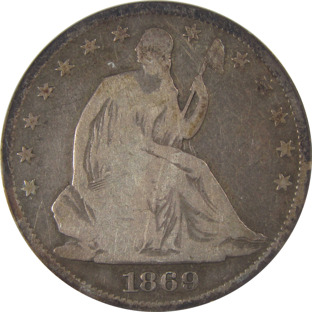 A genuine 1869 Seated Liberty Silver Half Dollar Coin, graded and certified G 6 by ANACS. Contains 90% Silver