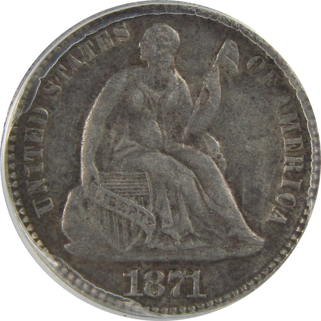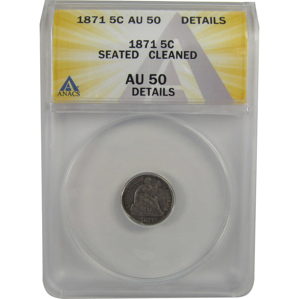 A genuine 1871 Seated Liberty Silver Half Dime Coin, graded and certified AU 50 Details by ANACS. Contains 90% Silver. Cleaned