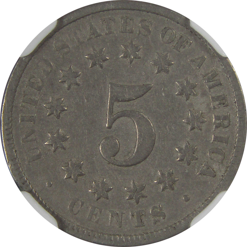 The classic Shield nickel of 1866-1883 replaced the silver half dimes of 1794-1873. The coin's obverse depicts a shield and wreath, while the reverse features a large numeral "5" inside a circle of 13 stars above the word CENTS.