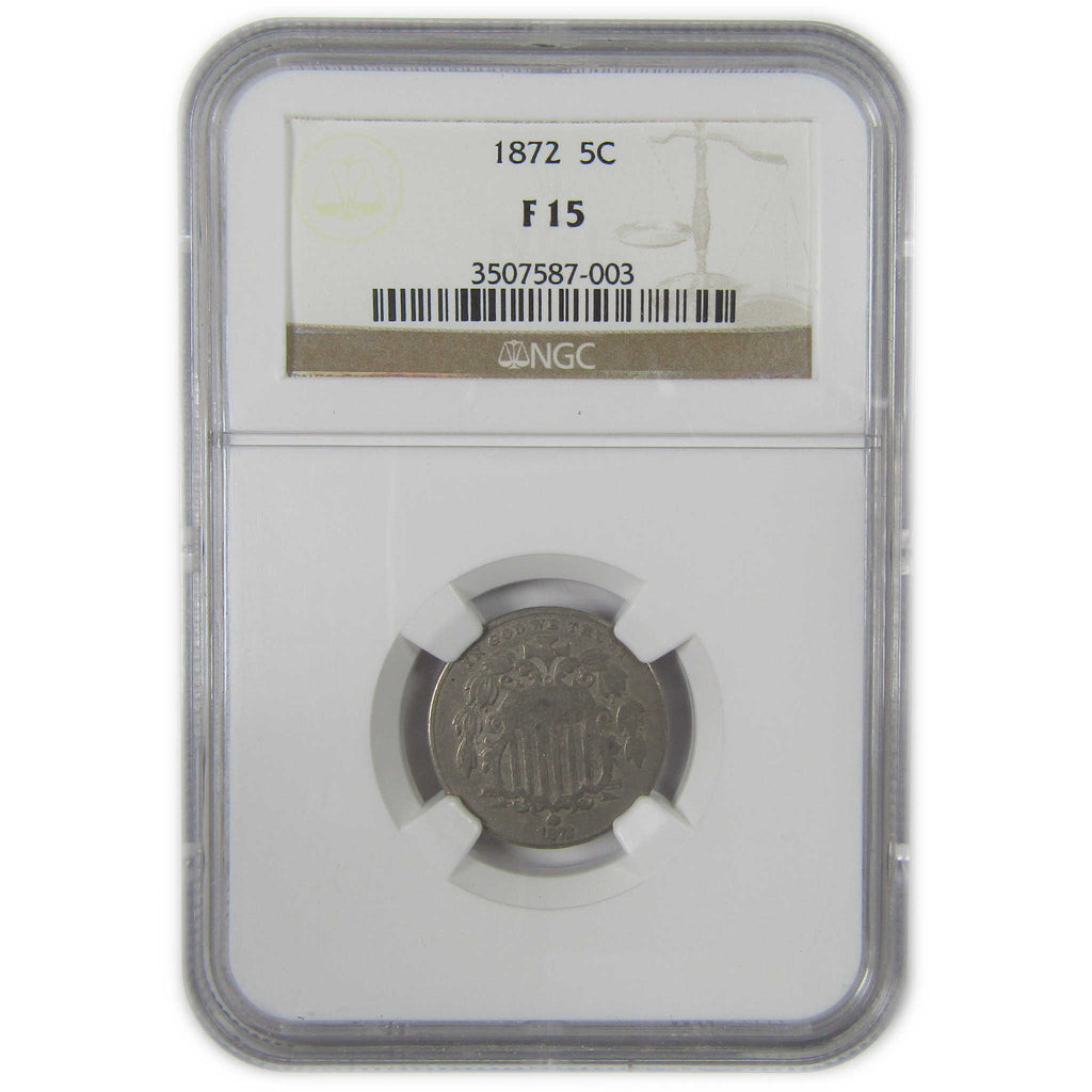 A genuine 1872 Shield Nickel Coin, graded and certified F 15 by NGC