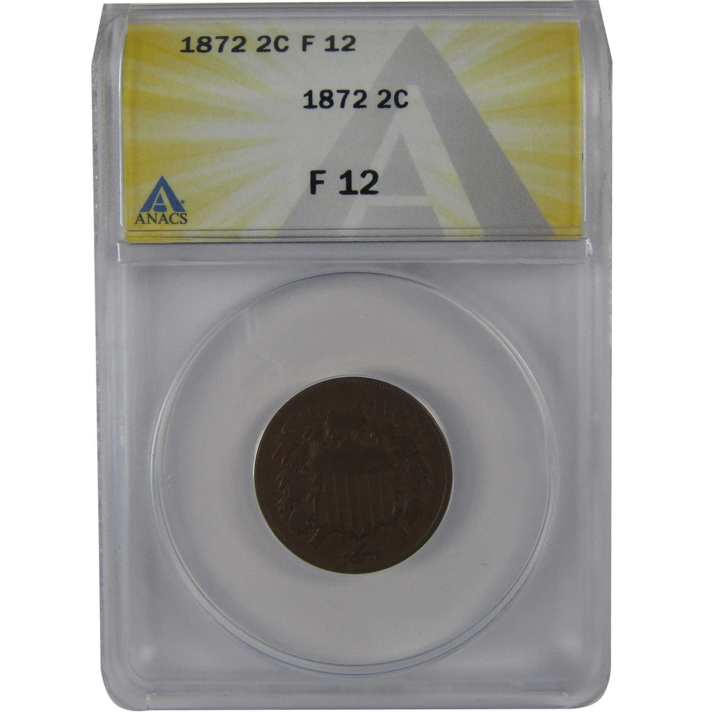 A genuine 1872 Two Cent Piece Coin, graded and certified F 12 by ANACS