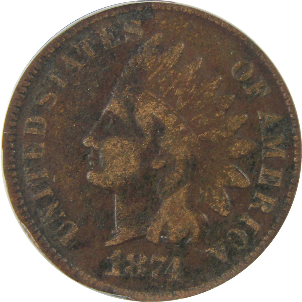 A genuine 1874 Indian Head Cent Penny Coin, graded and certified F 12 Details by ANACS. Corrosion
