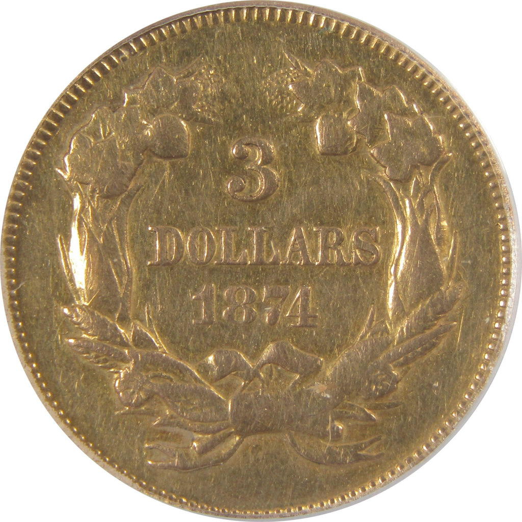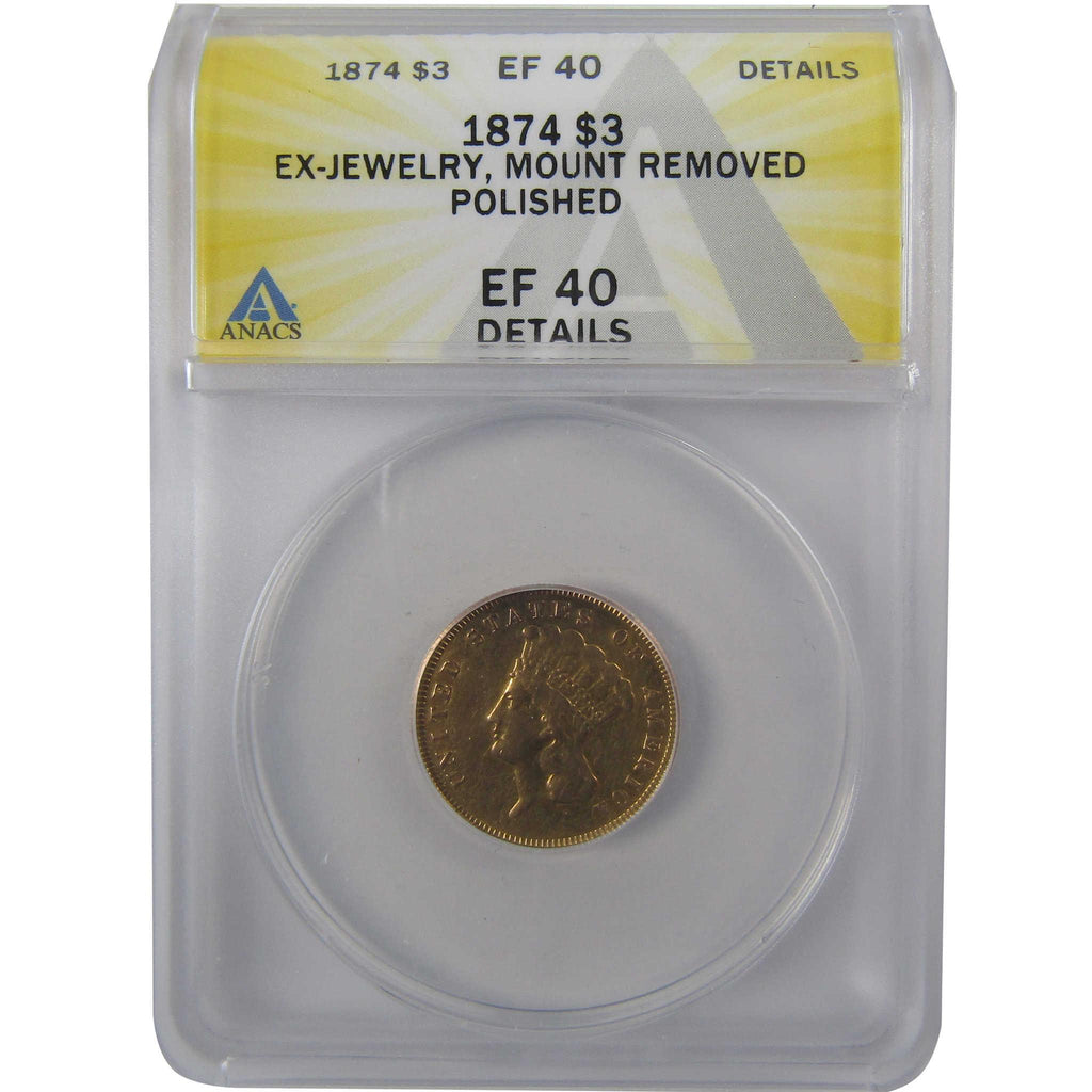 A genuine 1874 $3 Indian Princess Head Gold Coin, graded and certified EF 40 Details by ANACS. Contains 90% Gold. Ex-Jewelry, Mount Removed, Polished