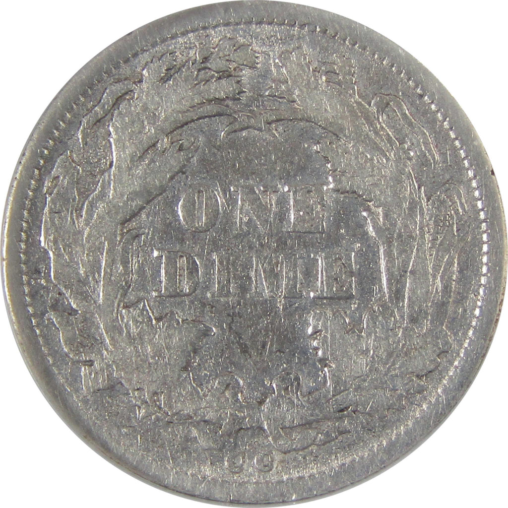 Designed by Christian Gobrecht, this 90% silver dime depicts Liberty seated on a rock, holding a shield in her right hand and a Liberty cap on a pole in her left. The reverse displays a wreath, the denomination and UNITED STATES OF AMERICA.