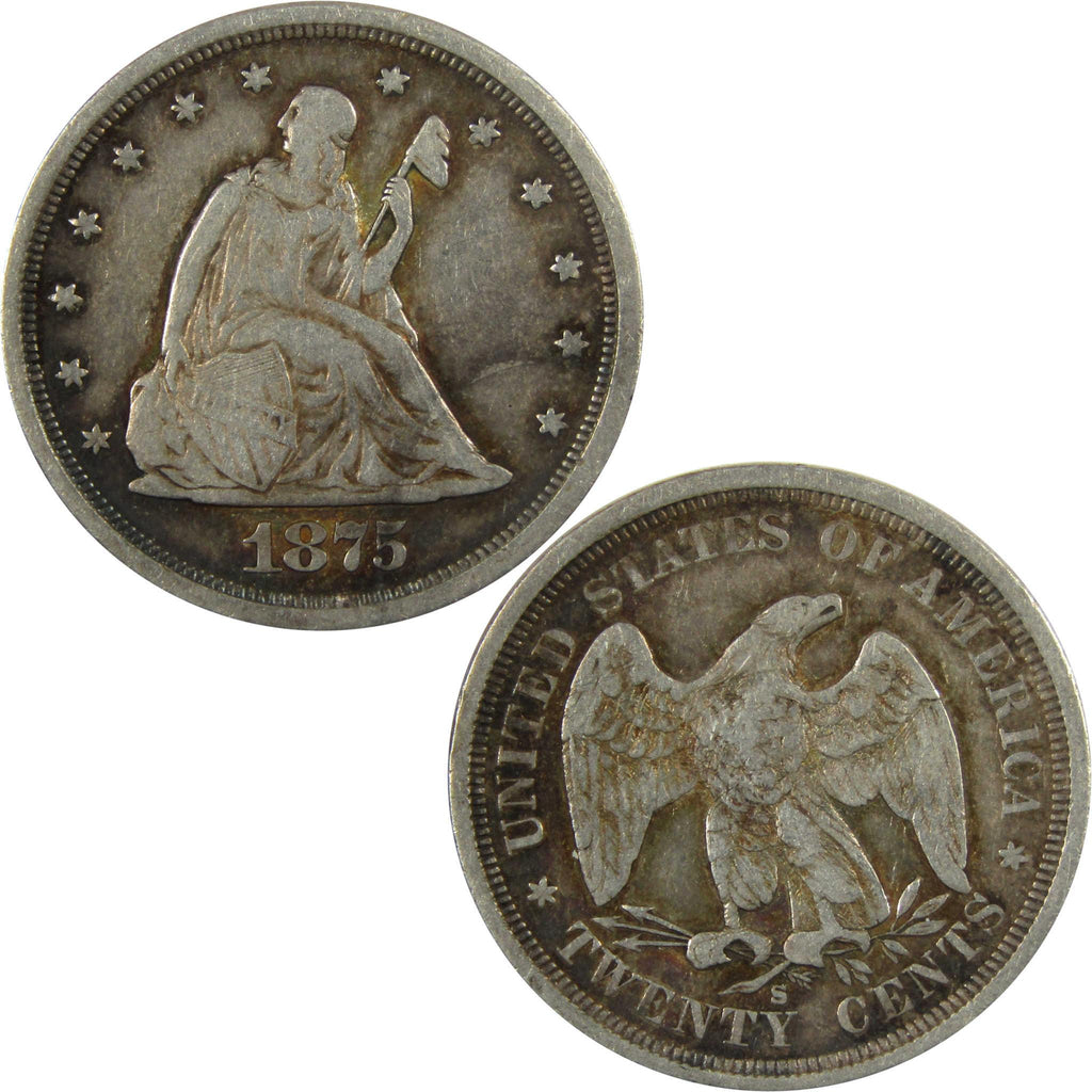 A genuine 1875 S Seated Liberty Silver Twenty Cent Piece Coin, in VF Very Fine Condition. Contains 90% Silver