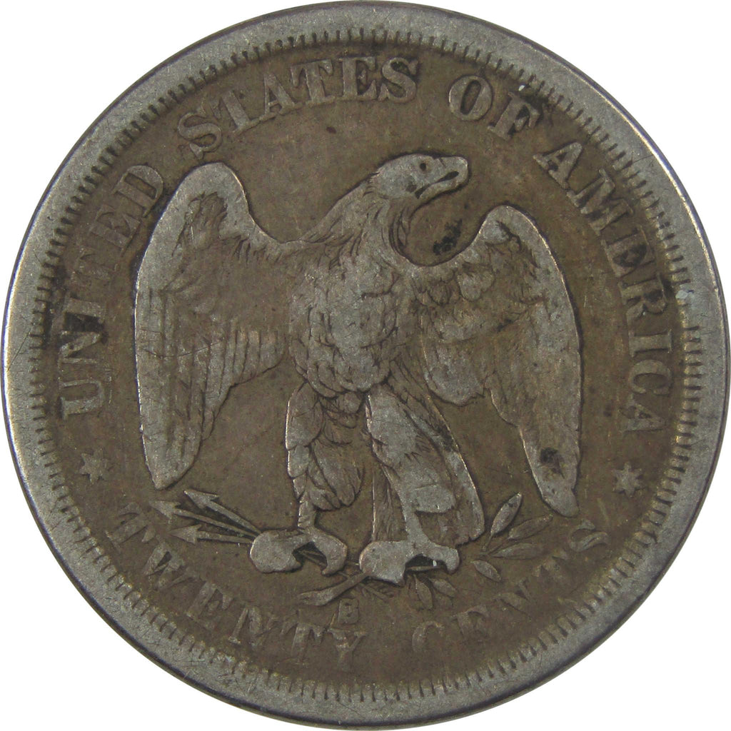 The Liberty Seated twenty-cent piece was the shortest-lived U.S. coin denomination. This century-old, 90% silver coin depicts 13 stars around Liberty, who sits on a rock with a Union Shield and a Liberty cap on a pole. The reverse shows an eagle with an olive branch and three arrows. Encircling the reverse are UNITED STATES OF AMERICA and TWENTY CENTS.