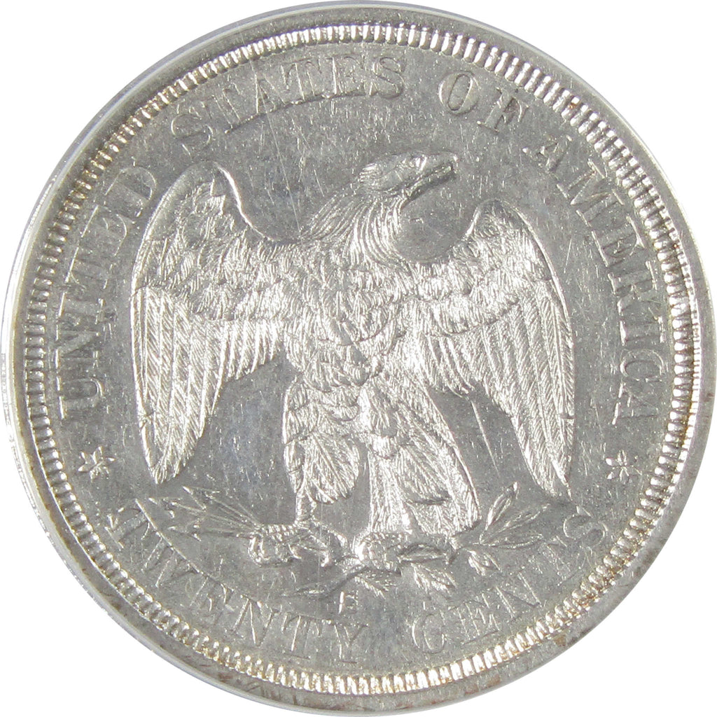 A genuine 1875 S Seated Liberty Silver Twenty Cent Piece Coin, graded and certified AU 55 by ANACS. Contains 90% Silver