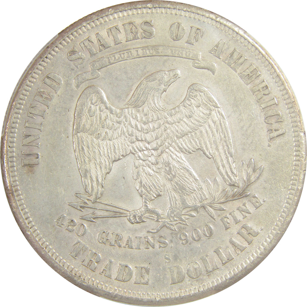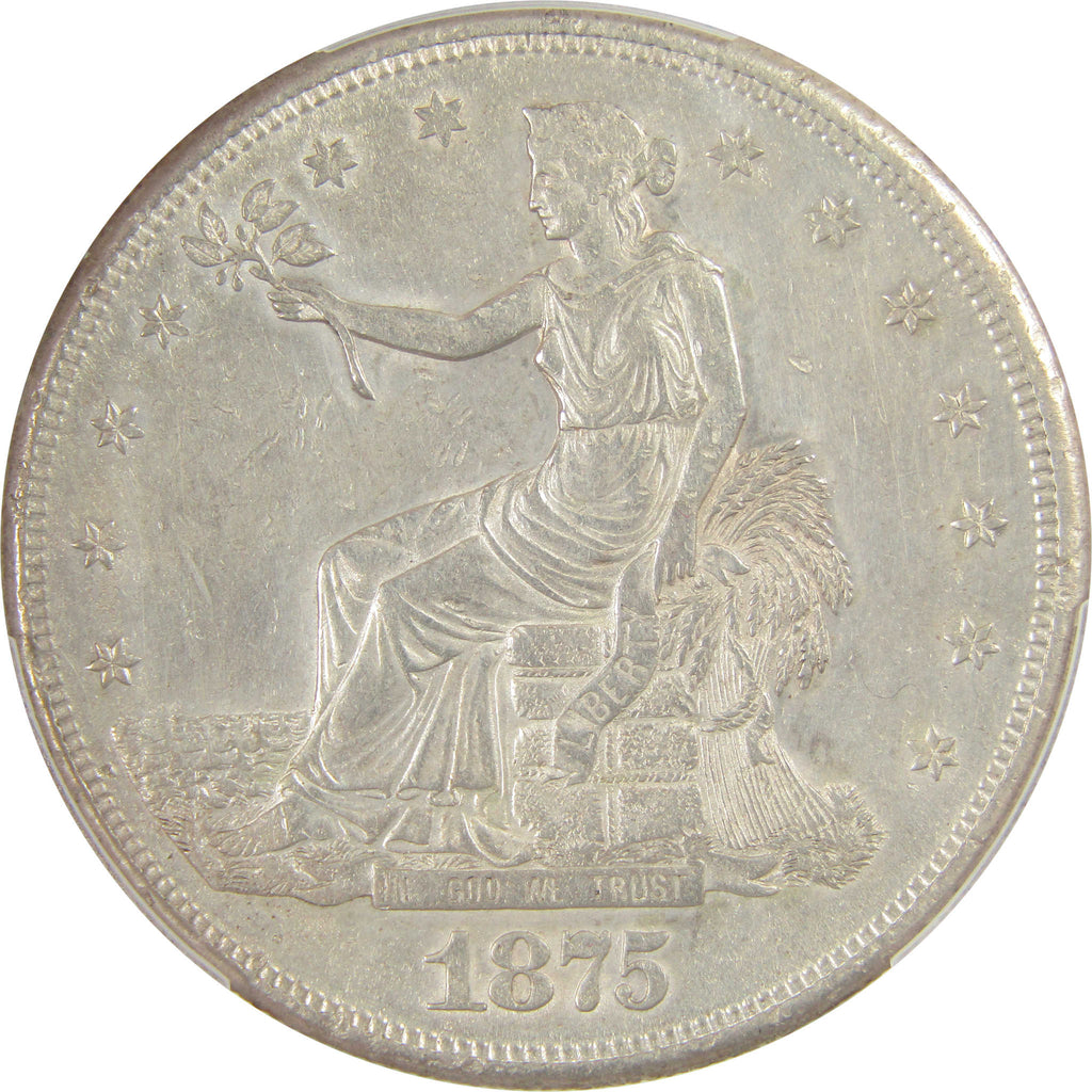 A genuine 1875 S Trade Silver Dollar Coin, graded and certified AU Details by PCGS. Contains 90% Silver. Cleaned