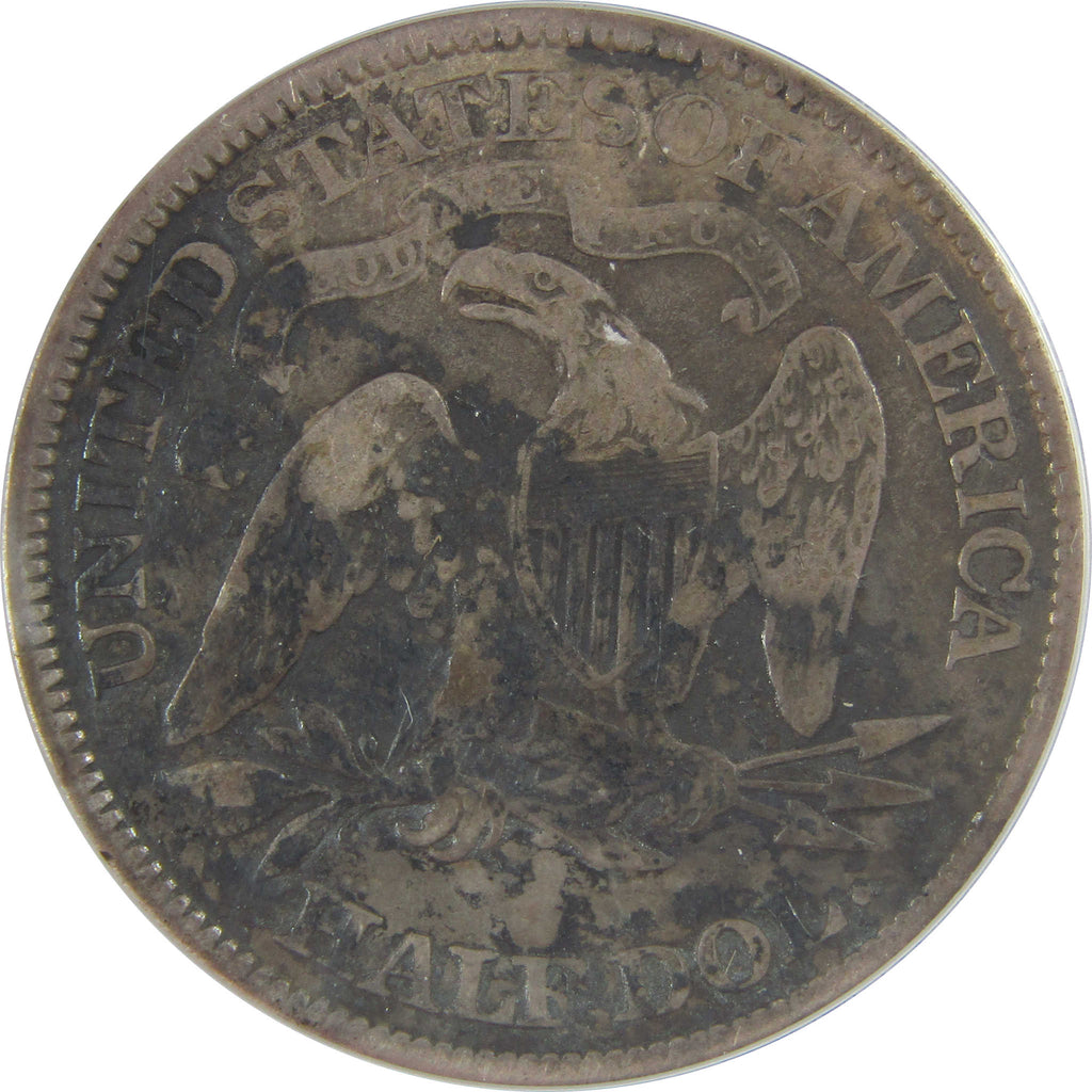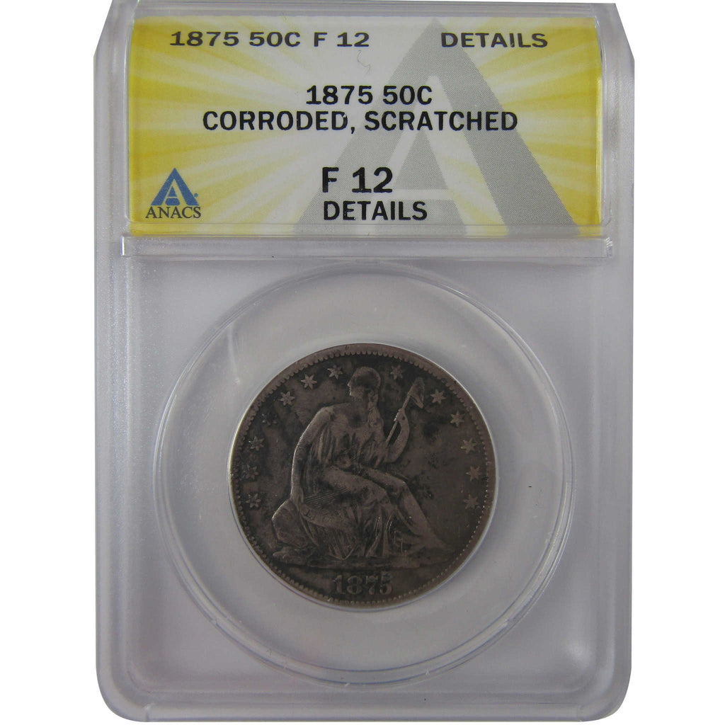 A genuine 1875 Seated Liberty Silver Half Dollar Coin, graded and certified F 12 Details by ANACS. Contains 90% Silver. Corroded, Scratched