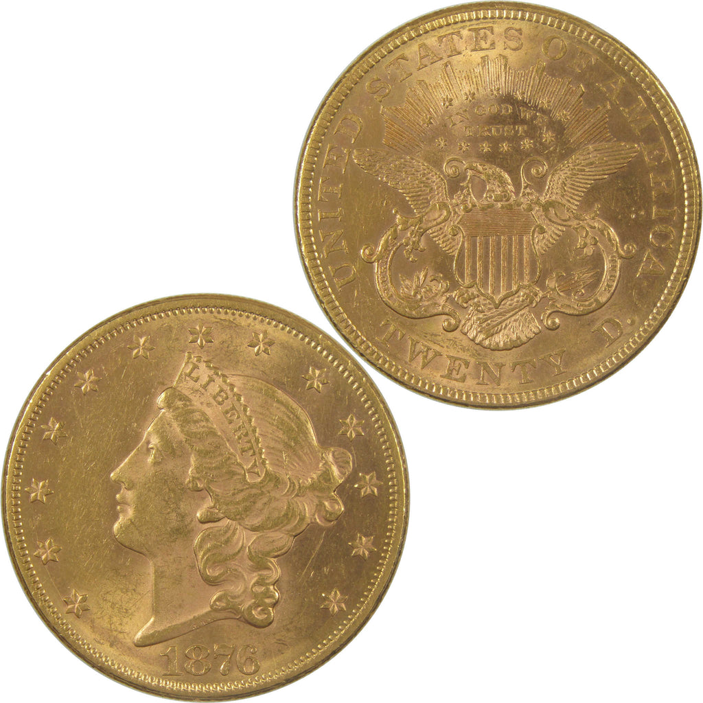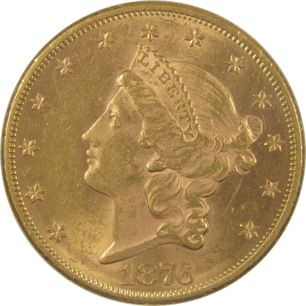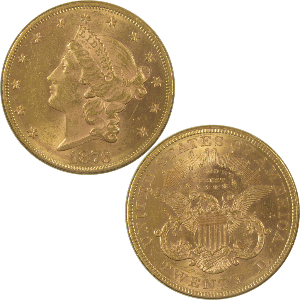 A genuine 1876 $20 Liberty Head Gold Double Eagle Coin, in Borderline Uncirculated Condition. Contains 90% Gold
