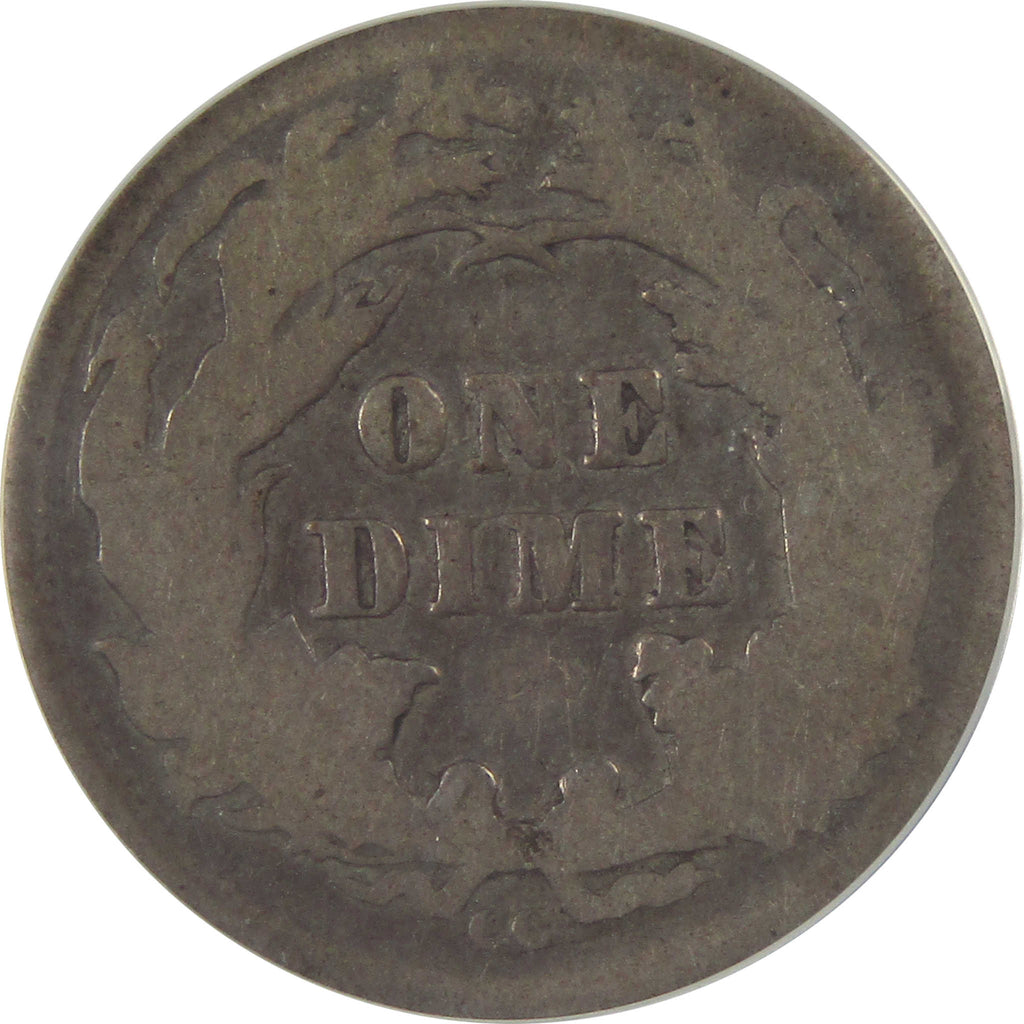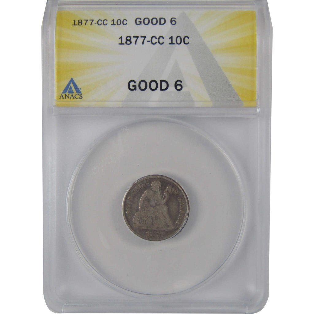 A genuine 1877 CC Seated Liberty Silver Dime Coin, graded and certified G 6 by ANACS. Contains 90% Silver