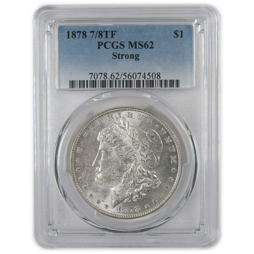 A genuine 1878 7/8TF Strong Morgan Silver Dollar Coin, graded and certified MS 62 by PCGS. Contains 90% Silver
